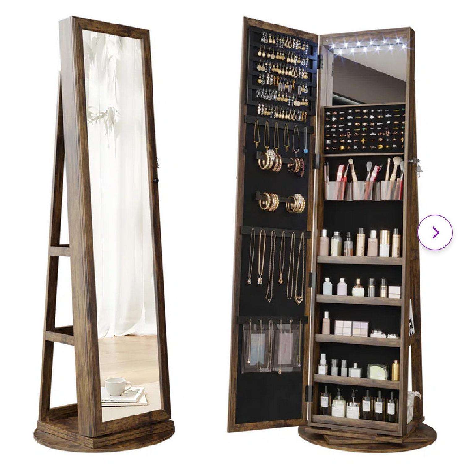 Seller's Notes:Large jewelry storage armoire provides a full view of your head-to-toe outfit. The built-in makeup mirror is convenient for you to select jewelry or apply make-up in front of the cabinet. The jewelry cabinet can rotate 360 degrees and has 3 shelves on the back to let you place more essentials easily. Lots of storage in the back with various sizes for storing small/large items. Have only had this a year and it's basically new! Fully- assembled More features: High-quality Materials - Quality MDF high hardness custom wood + soft black velvet lining. Waterproof, moisture-proof, and anti-deformation. Full-length Floor Mirror - Size: 61" x 14.5". Not only the beautiful scenery in your room but also a small expert in organizing. Let your accessories bid farewell to messy, more convenient ones to take and put on. Hidden Jewelry Storage Cabinet - 3 Racks on the back for larger storage and more convenient storage. The side adopts a triangular frame design, which is safe and stable. 360° Rotating Stable Base - 360° Swivel jewelry cabinet, no matter where you are, you can meet your needs for mirrors. SP
