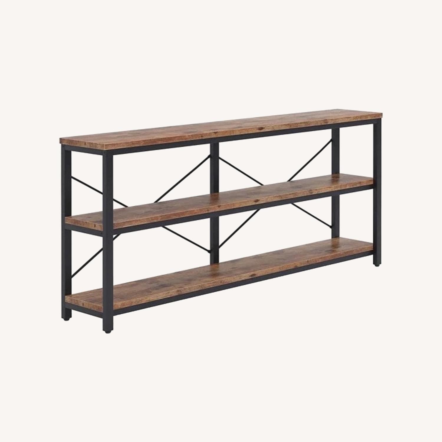 Seller's Notes:Console table sofa table for entryway and living room. long and narrow table, you can use this as a sofa table behind your couch, it’s a perfect entryway console table in a corner or a TV table in your living room, won’t let you feel too big or too wide. The industrial design gives off a rustic vibe and the heavy feeling matches most American furniture. Anti-slip leg pads protect your floor from scratches. Features Extra long table: Won’t take up much space in your living room, rustic look matches the most decorative style. Large storage space: 3 tiers with open shelves design offers you plenty of storage space. Durable and stable: This sofa console table is made of high-grade thickened MDF board and metal legs, and a double X-frame crossbar on the back to strengthen the stability. Easy assemble: Hardware and tools included. Also, all pieces are labeled by letter rather than tossed randomly in a bag. Industrial style-contemporary style: Three colors are available, and the rustic brown wood pattern adds a lot of warmth and character to your space. White creates a brighter atmosphere. Faux marble with a golden finish more modern and advanced style. 100% Satisfaction Guarantee: We offer 18 months of quality assurance and friendly after-sales service for all our products. Dimensions: 70.8" L x 11.8" W x 35.8" H, the height between each shelf is 15.16".
