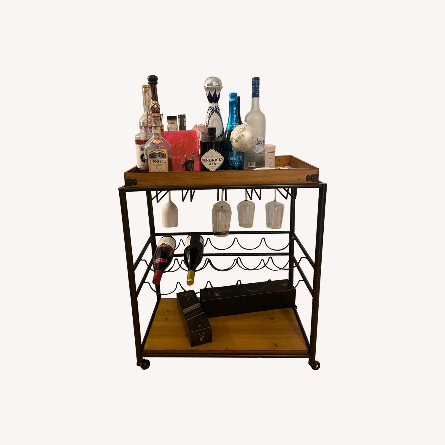 Seller's Notes:Beautiful and modern bar cart made from Fir wood and an iron frame with multi-use storage options and locking wheels for easy mobility. Top removable serving tray, wine glass hangers (15 glass capacity), 10 wine bottles storage capacity and bottom shelf. 16 inches deep, 28 inches wide, 32 inches high. Excellent condition - just a couple of minor scratches that are not noticeable unless you look really close.