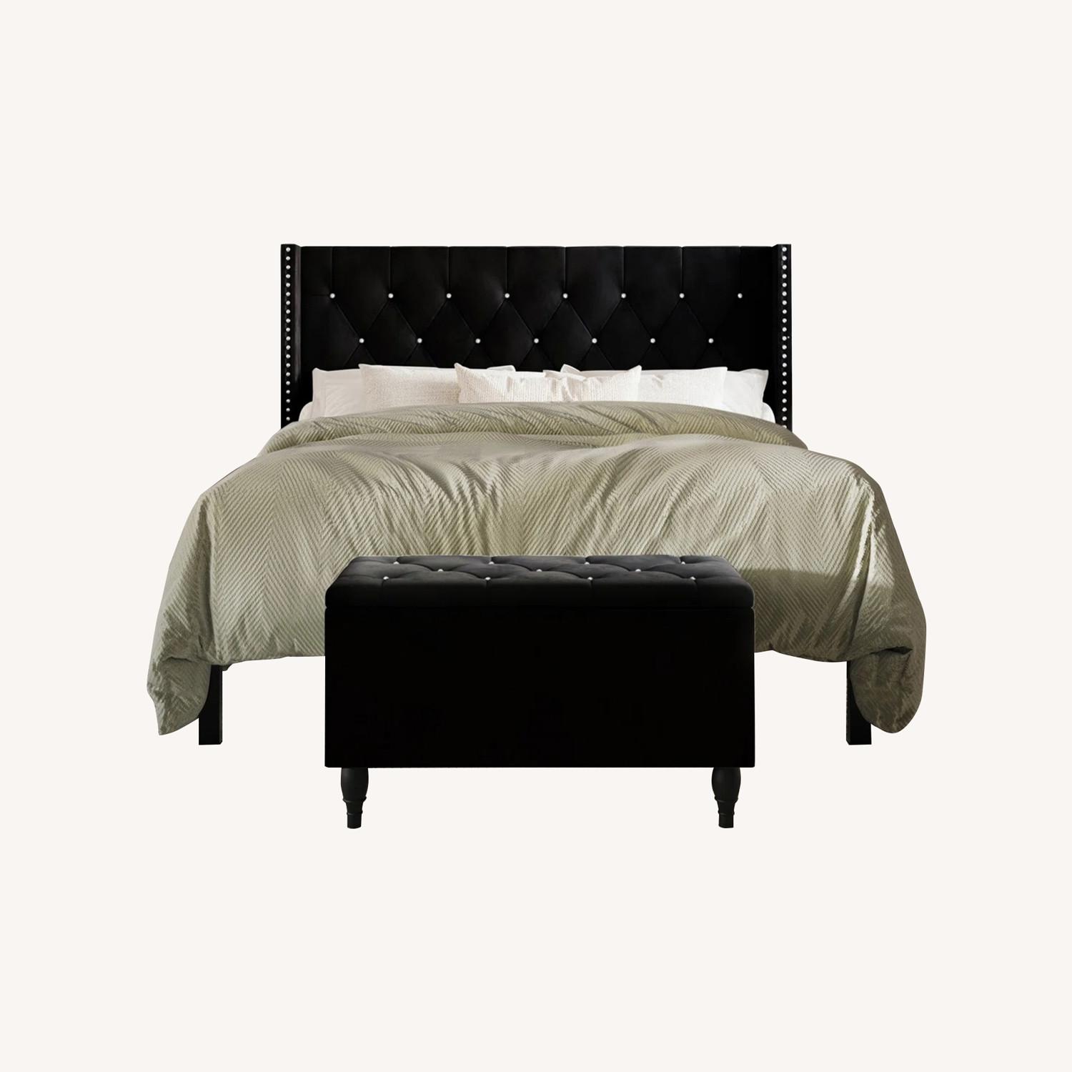 Seller's Notes:Upgrade your bedroom with this luxurious bed frame upholstered in 100% polyester velvet. The solid wood frame is designed with a diamond button-tufted headboard and wingback details with nailhead trim, making it perfect for any bedroom style. Store your items conveniently with the storage space under the bed. Plus, it comes with a matching storage bench made of solid wood and a high elastic sponge with a button-tufted top design. The bench features wooden legs that are durable and high-quality, and it has ample storage space for clothes, pillows, toys, and other sundries. Please note that a box spring or foundation is required. The bed is easy to assemble and comes with all the necessary hardware included. Enhance the look of your bedroom with this bed frame and matching storage bench set today. Note: Essential assembly components may be concealed within the furniture (e.g. inside headboards). Please check all compartments, including zipped areas, to locate all parts before assembly.