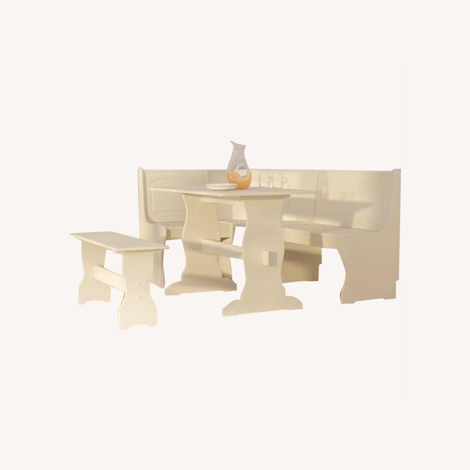 Seller's Notes:Add a cohesive look to your eat-in kitchen or breakfast nook with this three-piece dining set, crafted from manufactured wood and showcasing a corner side chair, one table, and a dining bench. Side benches lift for storage as seen in pictures.