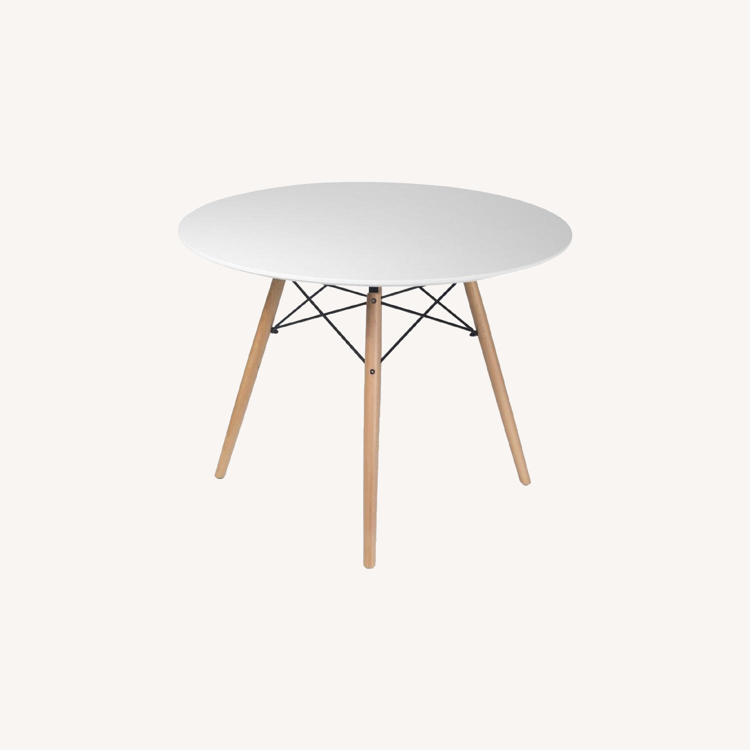 Seller's Notes:urchased from Wayfair. Crafted of manufactured wood in a lacquered white finish, the tabletop strikes a round silhouette with a smooth, reverse-beveled edge. Four flared dowel legs sport a rich woodgrain finish, while architectural metal stretchers lend added stability and support. Measuring 29.75" H x 39.5" W x 39.5" D overall, this dining table comfortably seats four, and pairs well with chairs having an 18" to 19" seat height.