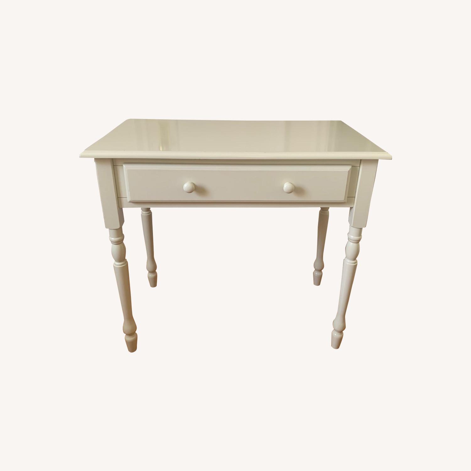 Seller's Notes:This is a rectangular writing desk. Handcrafted from solid and engineered wood, it features a flat top with beveled edges on four turned legs with tapered feet. One functional drawer is perfect for storing your stationery, paperwork, or art supplies, and the two-round button-like drawer pulls add a traditional touch to the outside. With almost 3' of length, this desk has a small space footprint that's just right for small bedrooms or office spaces – a great place for writing, studying, or reading. This desk has been used lightly as a home office desk. It is in great condition - only minor discolorations.