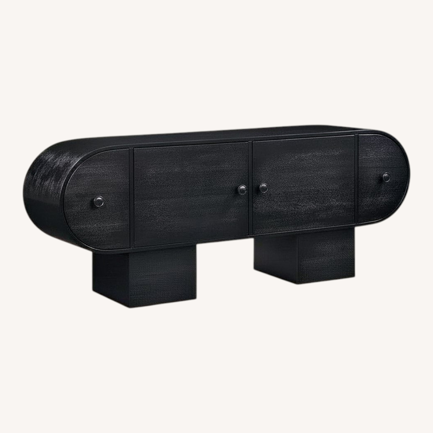This sideboard offers a stylish solution for keeping your essentials organized and out of sight. Crafted from a mix of solid and engineered wood, it showcases an oval-shaped cabinet on thick block legs for an Art Deco silhouette we're all about. With four doors and adjustable shelves, it provides ample storage for dinnerware, linens, or board games, while the surface is just right for trays and accent pieces. Plus, its wood grain finish in your choice of hue means each piece has its own character. Spot clean to keep it looking fresh.
