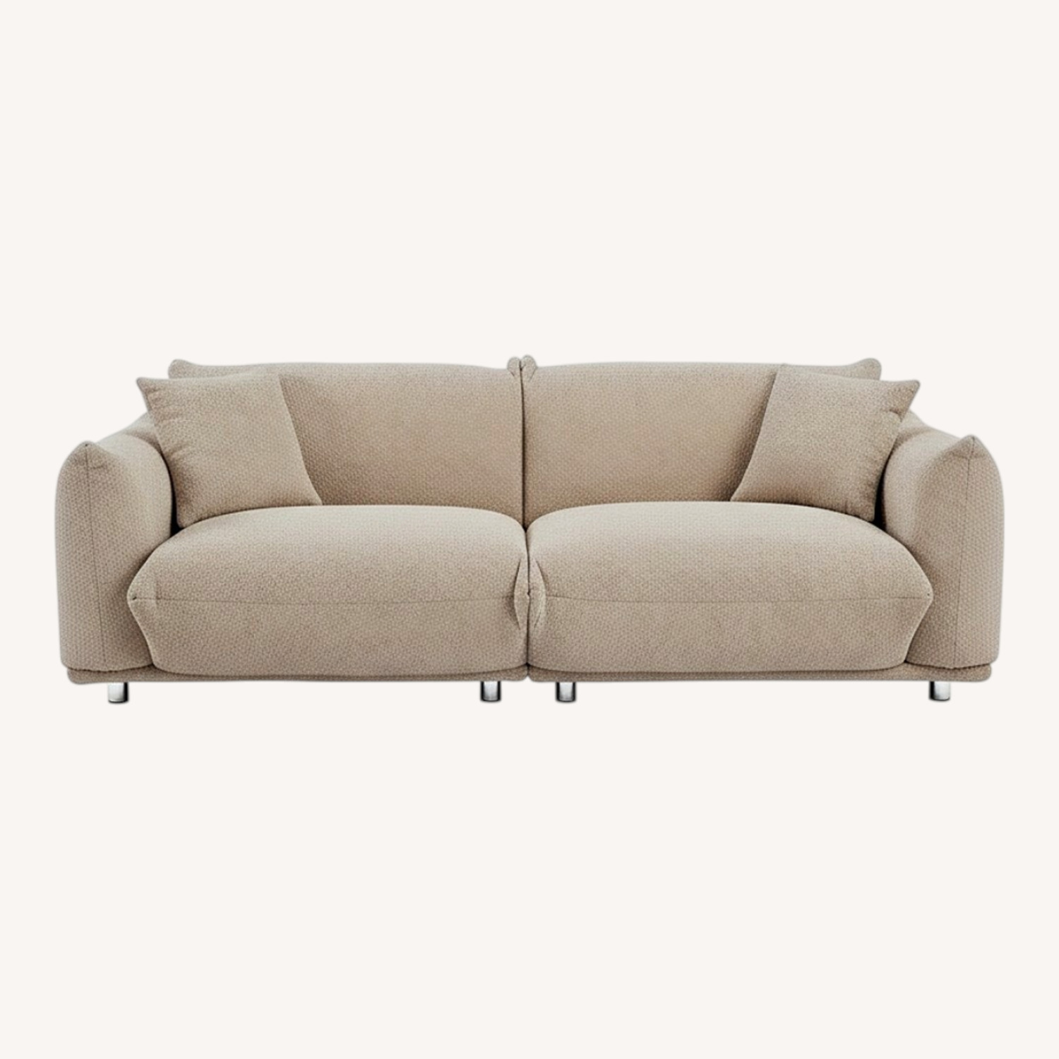 Seller's Notes:Elevate your living space with this modern 3-seater skin-friendly fabric sofa, designed for ultimate comfort and style. A plush Scandinavian-style minimalist sofa can liven up your living room décor. Featuring an ergonomic structure with contoured back cushions and two supportive lumbar pillows, this couch cradles your body for maximum relaxation. Upholstered in luxurious plush fabric, the extra-wide and thickened design offers a cloud-like seating experience. Built with a sturdy solid wood frame and high-density resilient foam, it ensures lasting durability. The sleek metal legs add a touch of minimalist elegance while providing stable support. Perfect for modern homes, this sofa combines functionality with a cozy, inviting aesthetic.