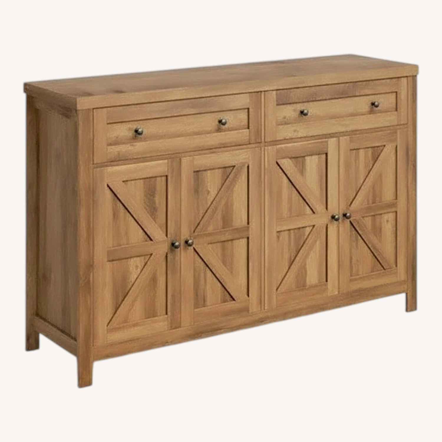 This classic sideboard blends farmhouse charm with practical storage for your dining room, living area, or entryway. Crafted from engineered wood with a two-tone finish, it features two upper drawers and four cabinet doors with X-panel detailing. Inside, four shelves—one adjustable—offer flexible space for dishes, linens, or pantry items. The 55” wide top surface provides room for a microwave, coffee maker, or decorative accents. We also love that it's both scratch- and water-resistant, making it a durable choice for everyday use.