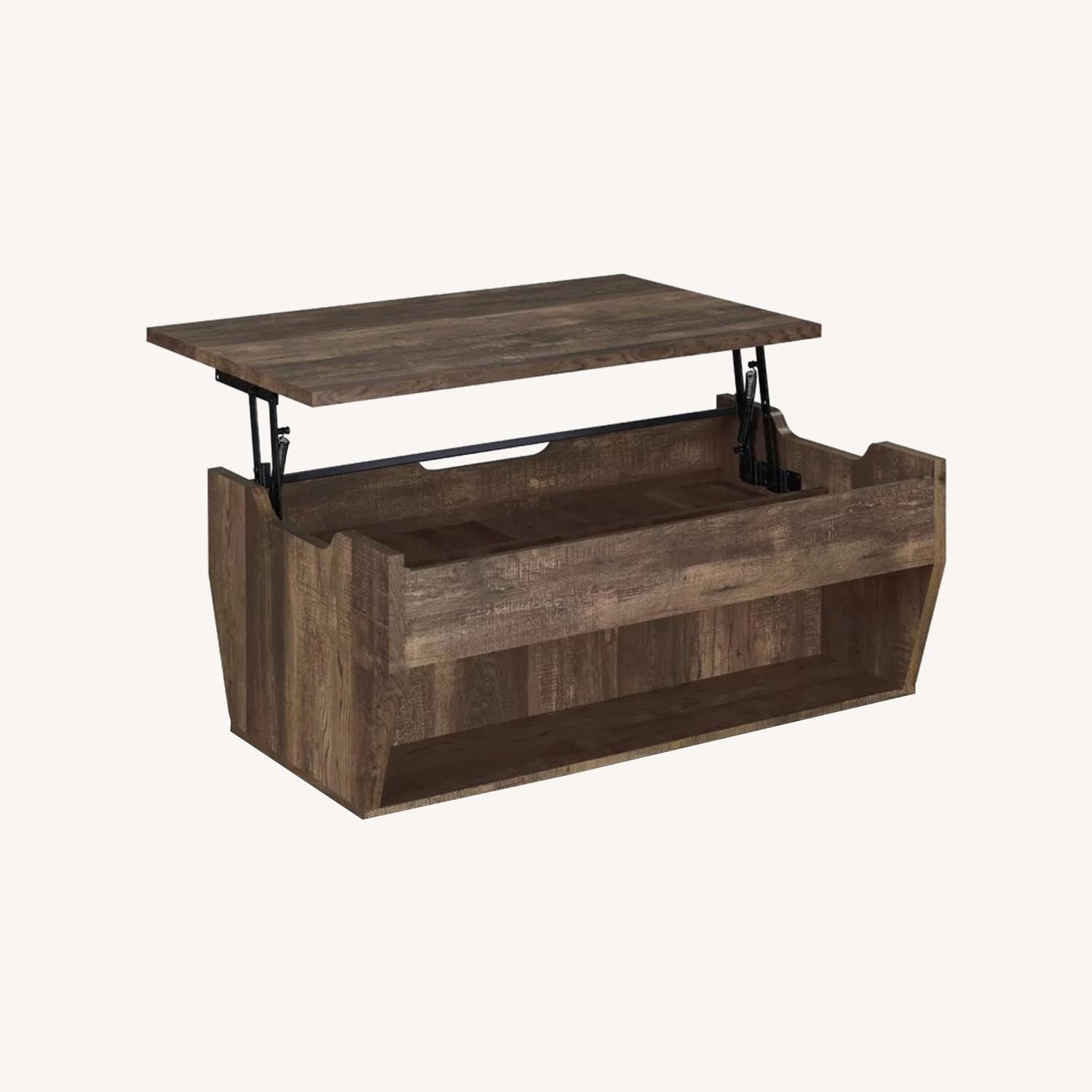 Seller's Notes:With ample space for all your living room essentials and then some, this lift-top coffee table is a must for clearing up cluttered living rooms. It's made from engineered wood in the finish of your choice. We love that it shows off the wood's grain color variation for a rustic vibe. It features an open lower shelf that's great for books and other small pieces of decor. Up top, it boasts separated compartments – some underneath the lift top and others that are exposed. Plus, the lift-top can also double as a desk so you can work straight from the sofa. Features - Lift-top makes it easy to work from the sofa - Divided interior storage compartment - Intriguing, angular silhouette - Wood grain embellishment