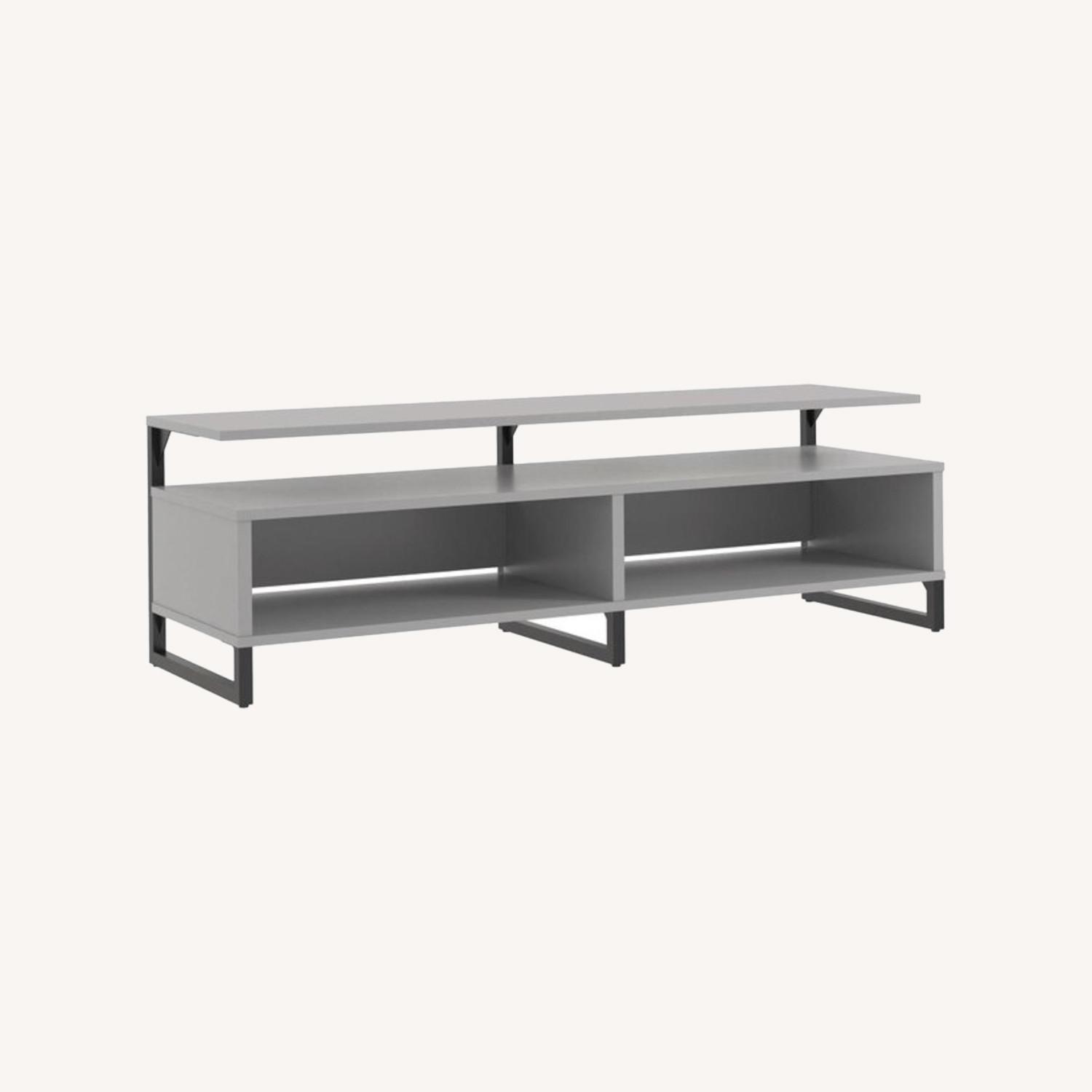 Made of laminated particleboard and powder-coated metal, the light gray finish pairs with the black metal for a sturdy build and updated look