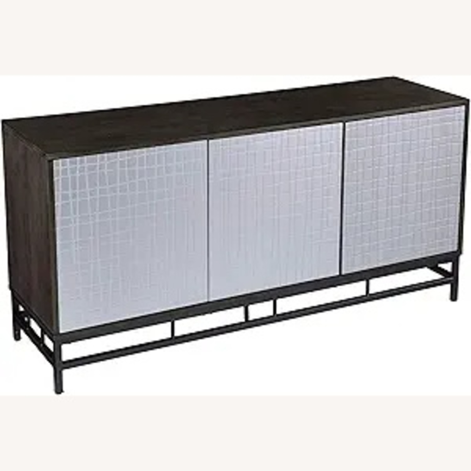 Modern credenza or storage sideboard Features 3 cabinets with 1 adjustable and 1 fixed shelf each Basketweave pattern on doors creates unique texture