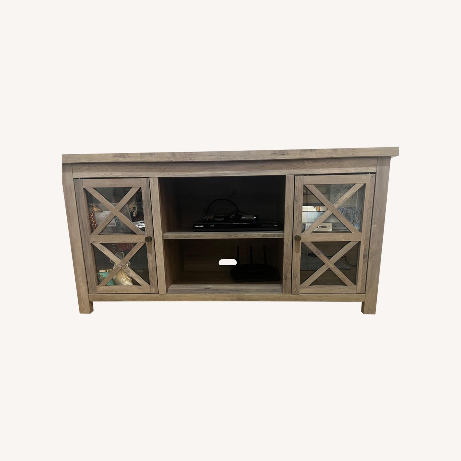 Seller's Notes:This TV stand/media console is a classic piece for any living space! It will accommodates a TV screen up to 55 inches. It includes two cabinet doors with two sets of shelves. The color is a lovely gray/white wood finish. The center shelves include cable management cutouts to keep wires out of sight.