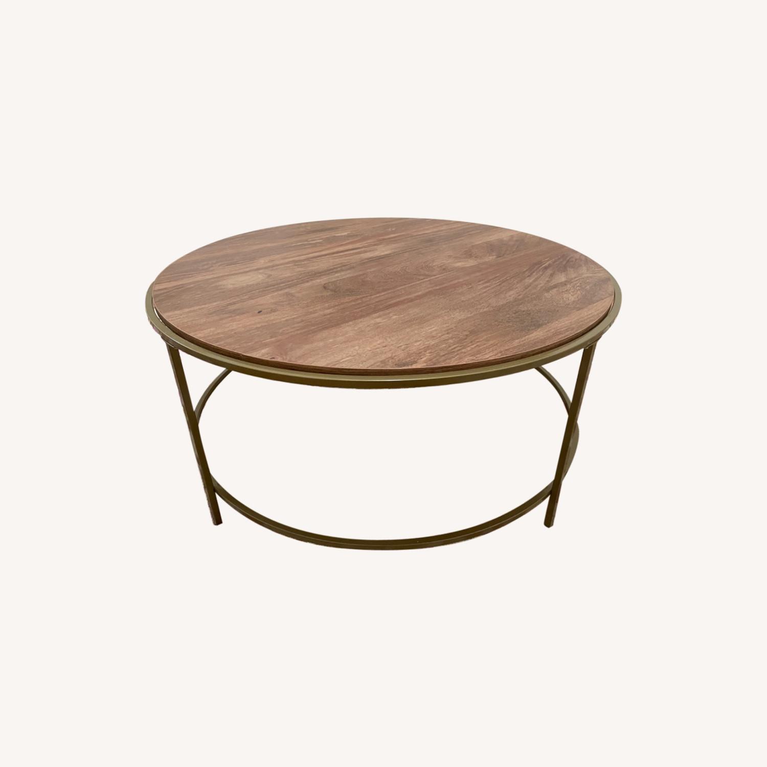 Seller's Notes:Circular wood and gold coffee table in perfect condition. Only selling because I ended up purchasing a different coffee table that better fit my living space.