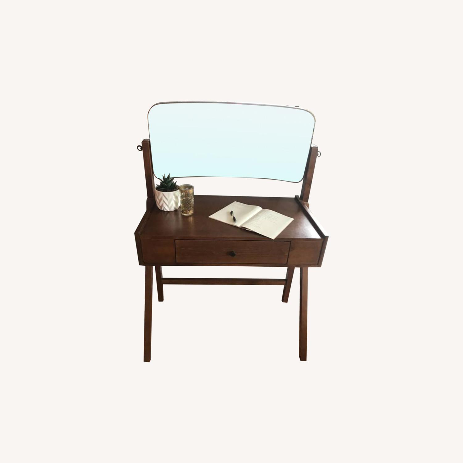 Seller's Notes:Beautiful mid-century style vanity in excellent condition. It is sturdy, has a spacious drawer, and has an adjustable mirror. I've owned it for about a year, and it has been in a home with a cat. There is probably some minor scratches from being moved, but none that I can find.