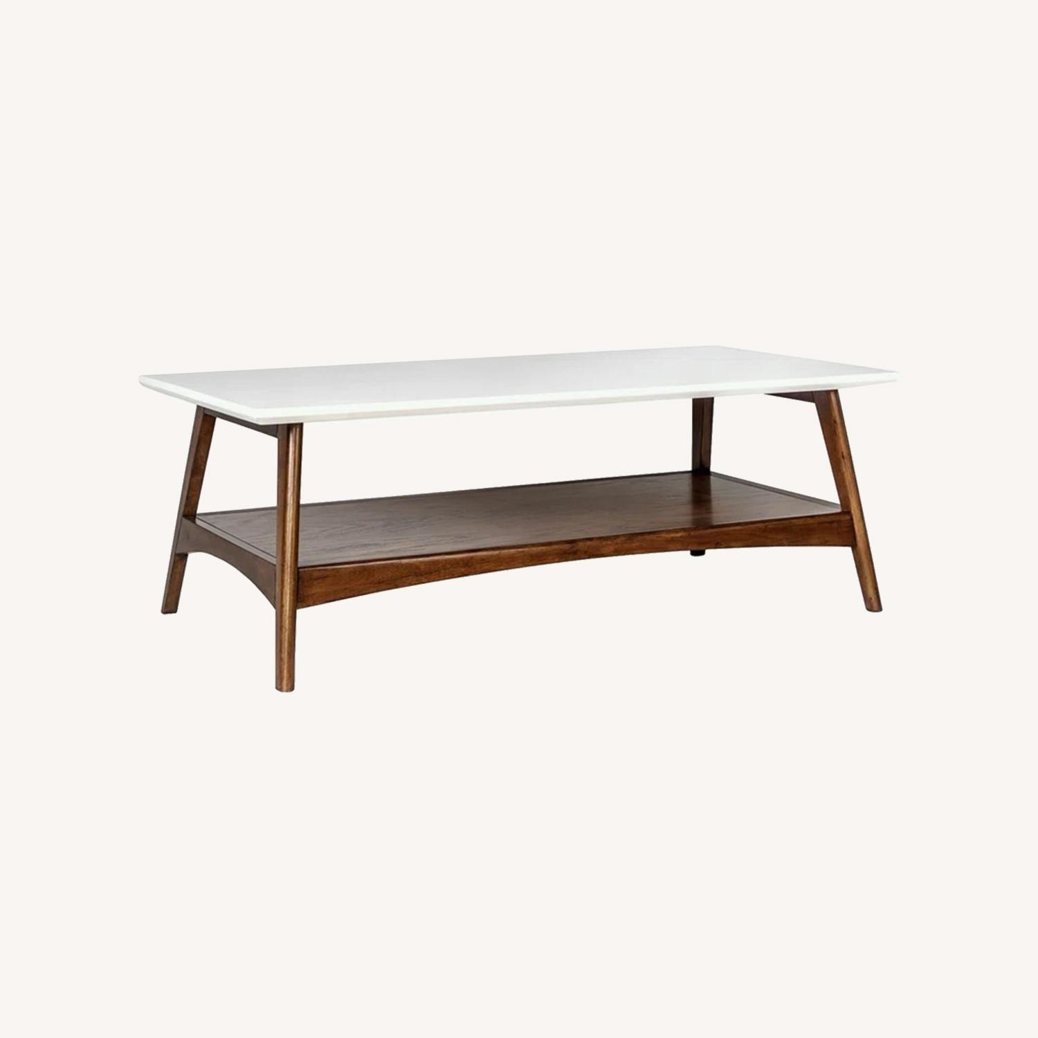 Seller's Notes:The pecan leg on the coffee table offer a midcentury modern silhouette in addition to functional storage. The materials are easy to clean and don't scuff easily. Minor blemishes on the top of the table are not super noticeable and especially simple to cover up with some candles or coffee table books! Great condition and has served me well with the wood and natural tones of my apartment.