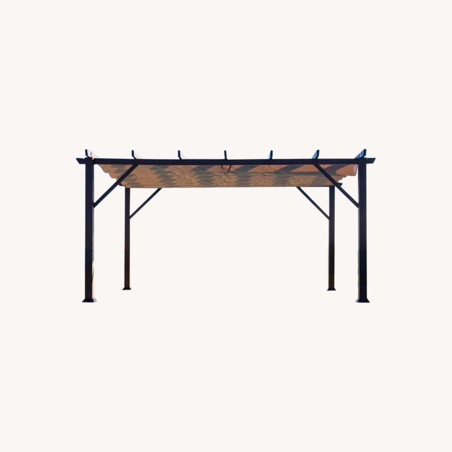 Seller's Notes:This pergola with its beautiful espresso frame color and the mocha canopy is the ideal pergola for any backyard. Perfect for use next to a pool or hot tub. Create the new outdoor space you have always dreamed of. The manually operated top canopy allows you to decide how much sunlight you want to enjoy. The Pergola is designed for 12-month use. It does not have to be taken down when the weather changes. It can sustain wind gusts up to 80 miles per hour. When it snows, simply slide your convertible top all the way open.