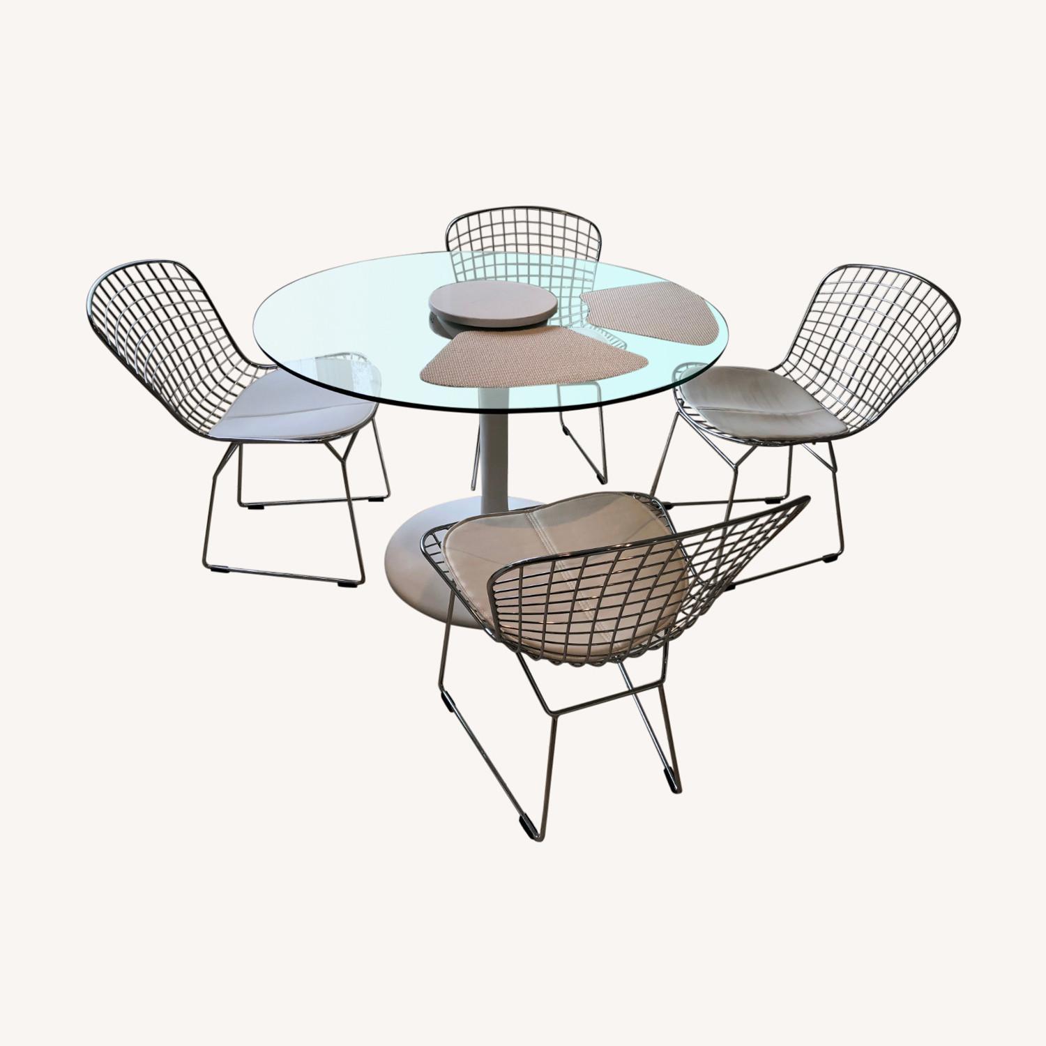 Seller's Notes:Purchased for a house staging this set is the perfect contemporary peice. White and Chrome table and 4 chairs Chairs seat 18" high and 30" overall. Seat is 16" x 18" with a white leather pad. Private Home no elevator