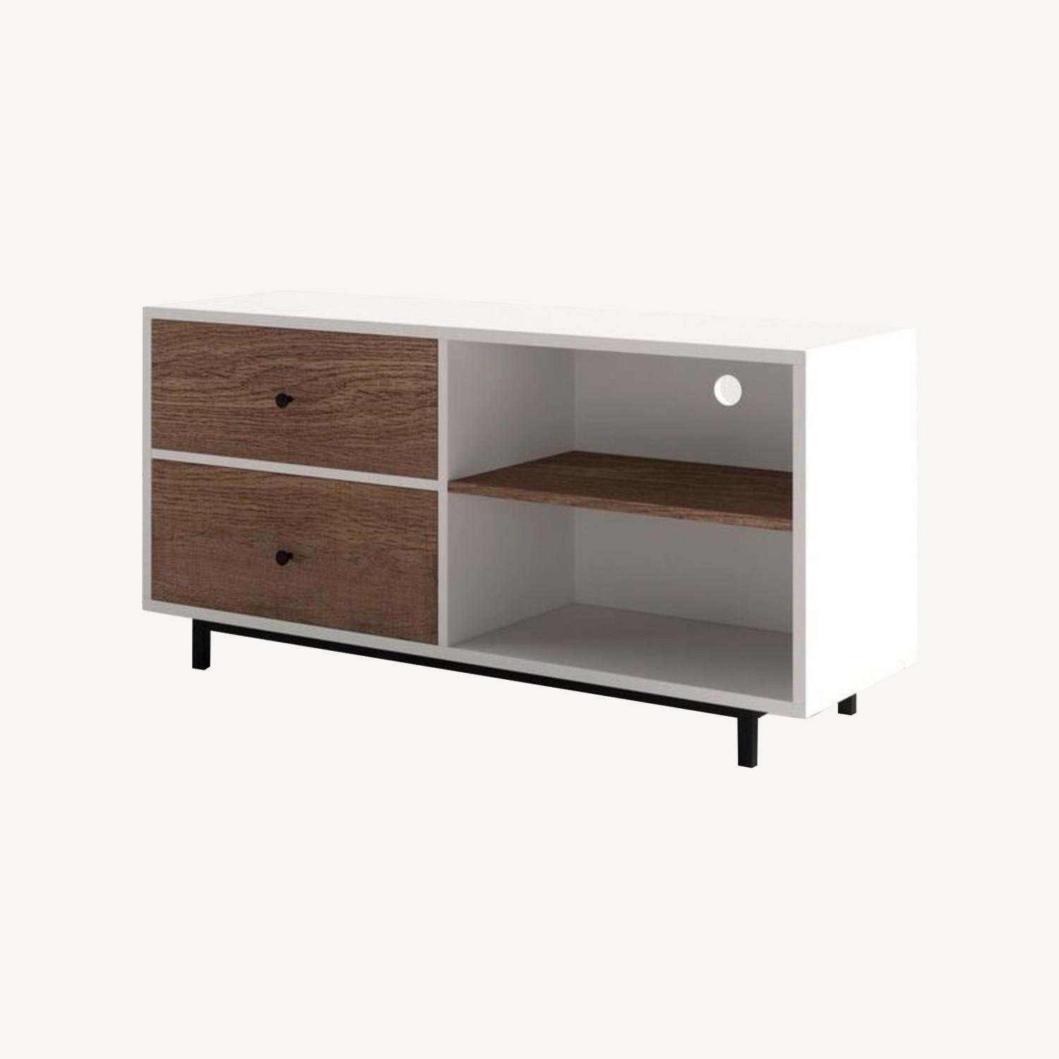 Seller's Notes:Brown and White media stand/console. Great condition, only blemish is two screws missing from the little shelf in the middle, but it balances really well, easy to fix with just two screws to hold it up. Lots of storage space in the drawers and perfect for small apartments.