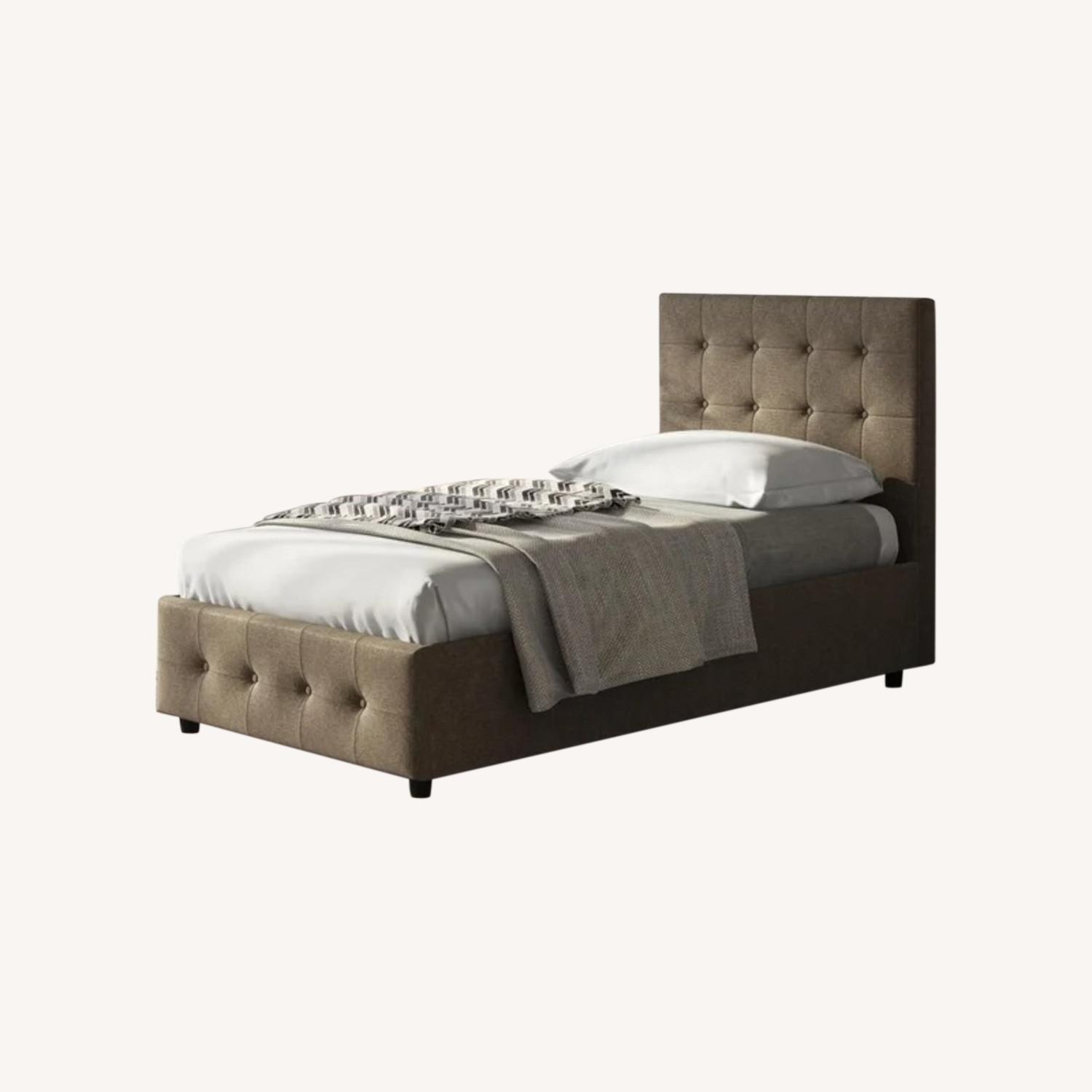 Seller's Notes:Twin size storage bed with raisable mattress. Linen upholstery. In like-new condition. No box spring required. Mattress is lifted by pulling a fabric handle at the foot of the bed (medium force required). Hoping to sell quickly! Storage compartment height: Approximately 10 inches.
