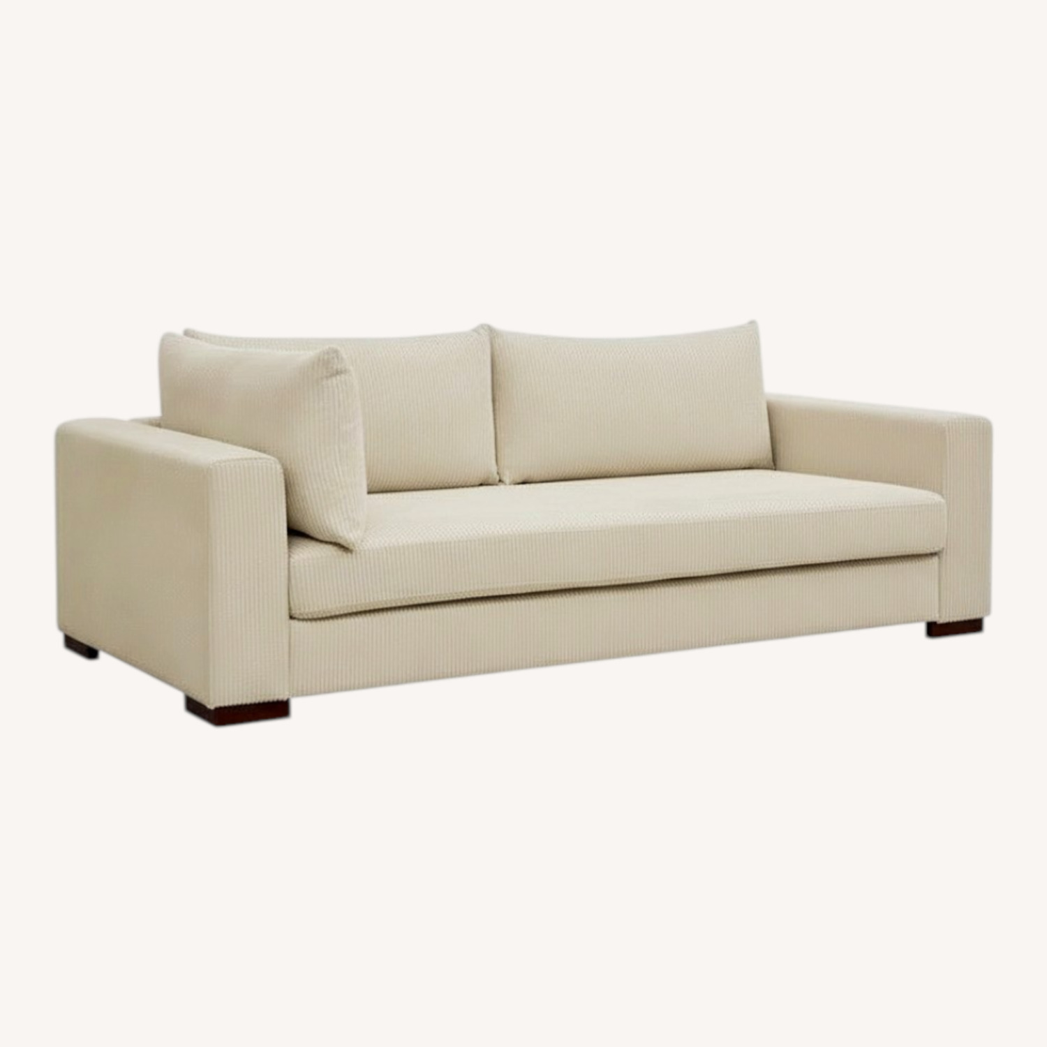 This sofa has enough space to seat three people, bringing a sleek, streamlined look to your living room. It features an engineered wood frame that rests on solid wood corner block feet. Wrapped in textured corduroy fabric in a hue of your choice, this couch is also filled with foam, polyester, and coil springs for a balance of padding and stability: square arms and a cushion back round out this classic design. Two toss pillows are also included with this sofa.