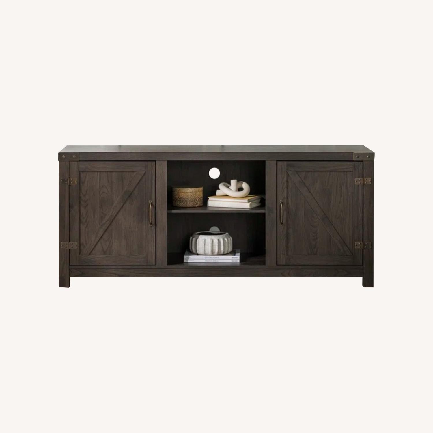 Let your space speak your cozy lingo with this double barn door TV stand. Settle into movie night with a piece that flaunts a subtle farmhouse charm with equally admirable defining features, like its metal corner accents, exposed hinges, and bronze hardware. Three adjustable shelves are prime places for your media essentials for hassle-free watch parties or solo series binges. Two barn doors offer concealed storage for bins or movies, and a center-open cubby debuts display space for décor. Come home to comfort, and retreat to your favorite show and the homey refuge of this two-toned TV stand.