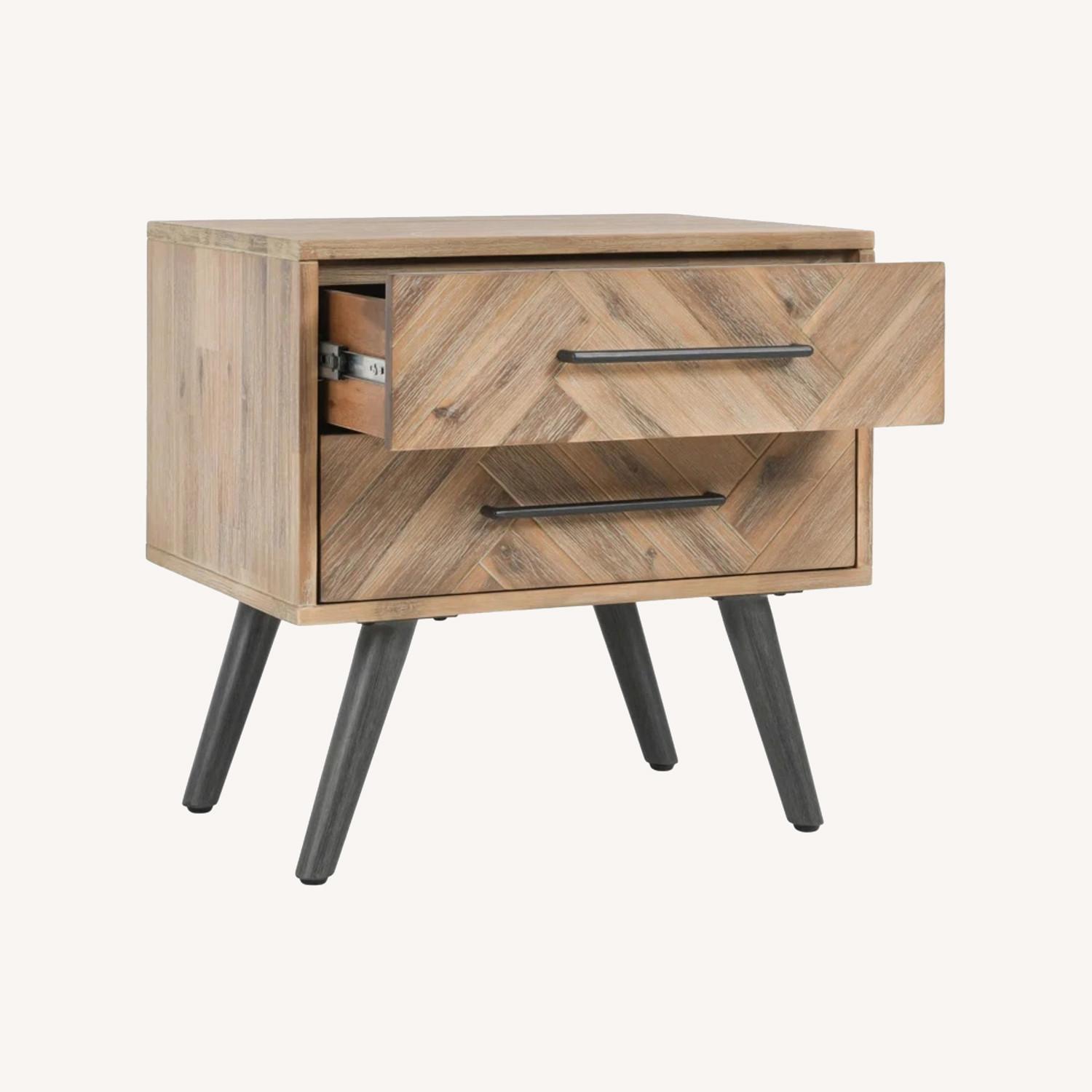 This perky nightstand (or end table) fuses clean lines with a mid-century modern aesthetic for a look we love. It is crafted from kiln-dried solid wood with a neutral finish that highlights the natural grain variation, and it stands on slender tapered legs. The two drawers sit on ball bearing glides for smooth operation and the fronts have a herringbone inlay that adds visual interest. The sleek black metal hardware leans into the modern look. Top this table with an accent lamp and a favorite framed photo. Partial assembly is required, and all tools are included.