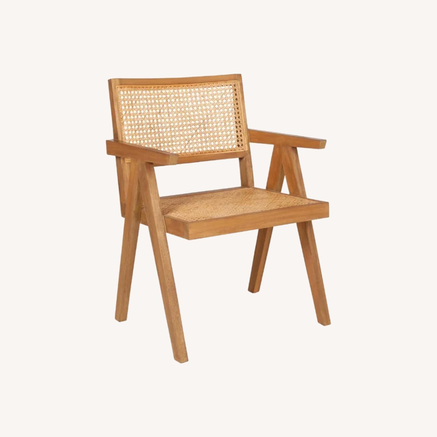Seller's Notes:Perfect condition Not even a year old Set This 22" wide woven armchair adds extra seating space in your living room or den. It's crafted from solid mahogany wood with a natural, semi-gloss finish, and it features angled legs with straight arms for a modern look. The square seat and handwoven back are crafted from natural rattan for an open and breezy look that brings coastal farmhouse design to your space. Plus, the woven cane back adds texture that offers a sleek color contrast. To clean, we recommend wiping this chair with a clean, dry cloth. Natural Variation: this product is made of natural materials, which makes it unique and can lead to slight color and/or size variations
