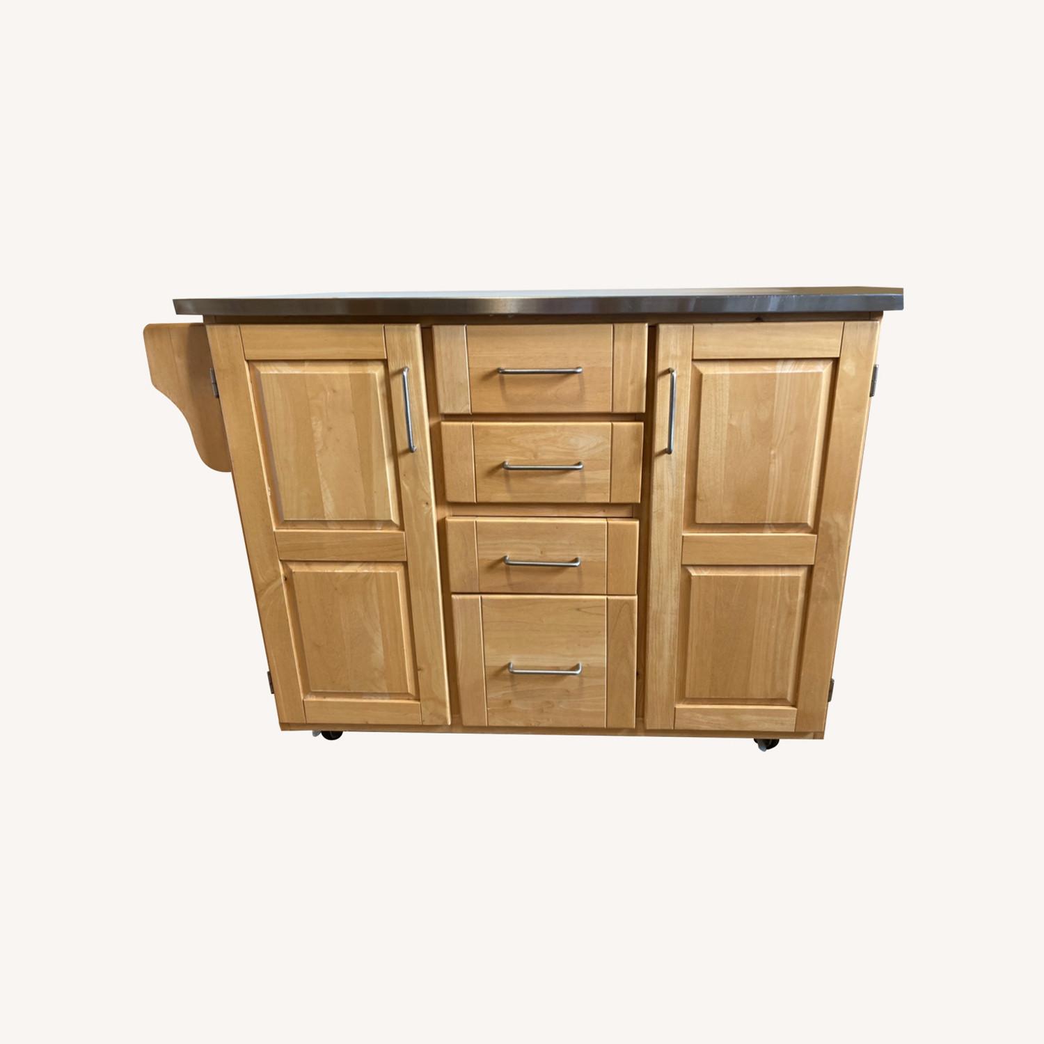Seller's Notes:Wasn't able to remodel my poorly designed kitchen, so I used this rolling island to fill in the blanks and pull things together instead! This versitile and useful piece provides additional counter and food prep space, room for dish towels, and storage for kitchen items both large and small. It has an optional wooden limb on the back. Depth with the limb in use is 29.5 inches. The metal top has many micro scratches from use, it's clearly not new but is not in any way an eye sore. The right side of the unit has a scratch and some discoloration, and the third drawer from the top center hangs just a bit low.