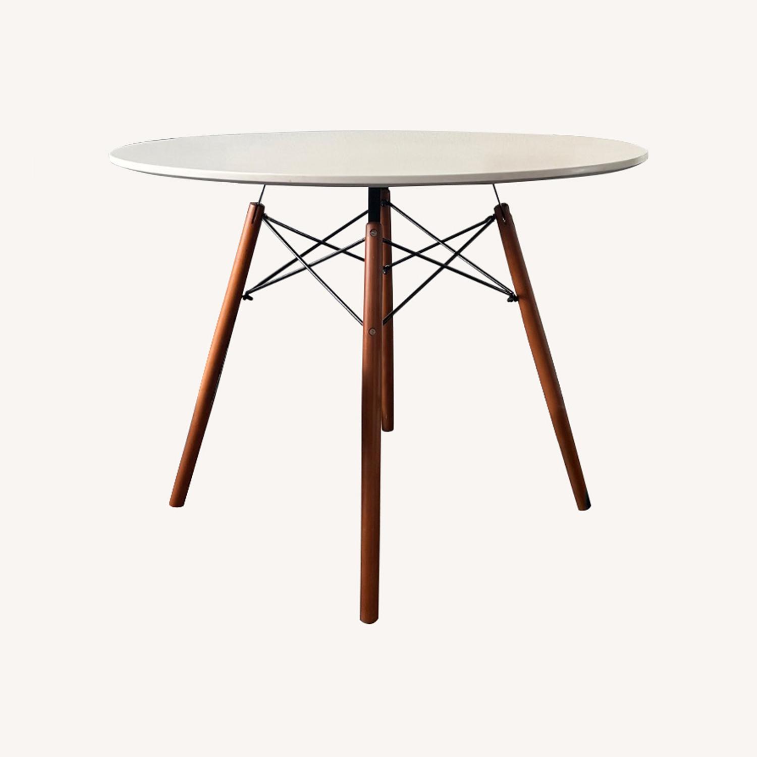 Seller's Notes:CHAIRS NOT INCLUDED. Round table top with flared walnut colored dowel legs. Can seat 4 comfortably. Has a few minor scraps and scratches but is easy to clean, in good condition.