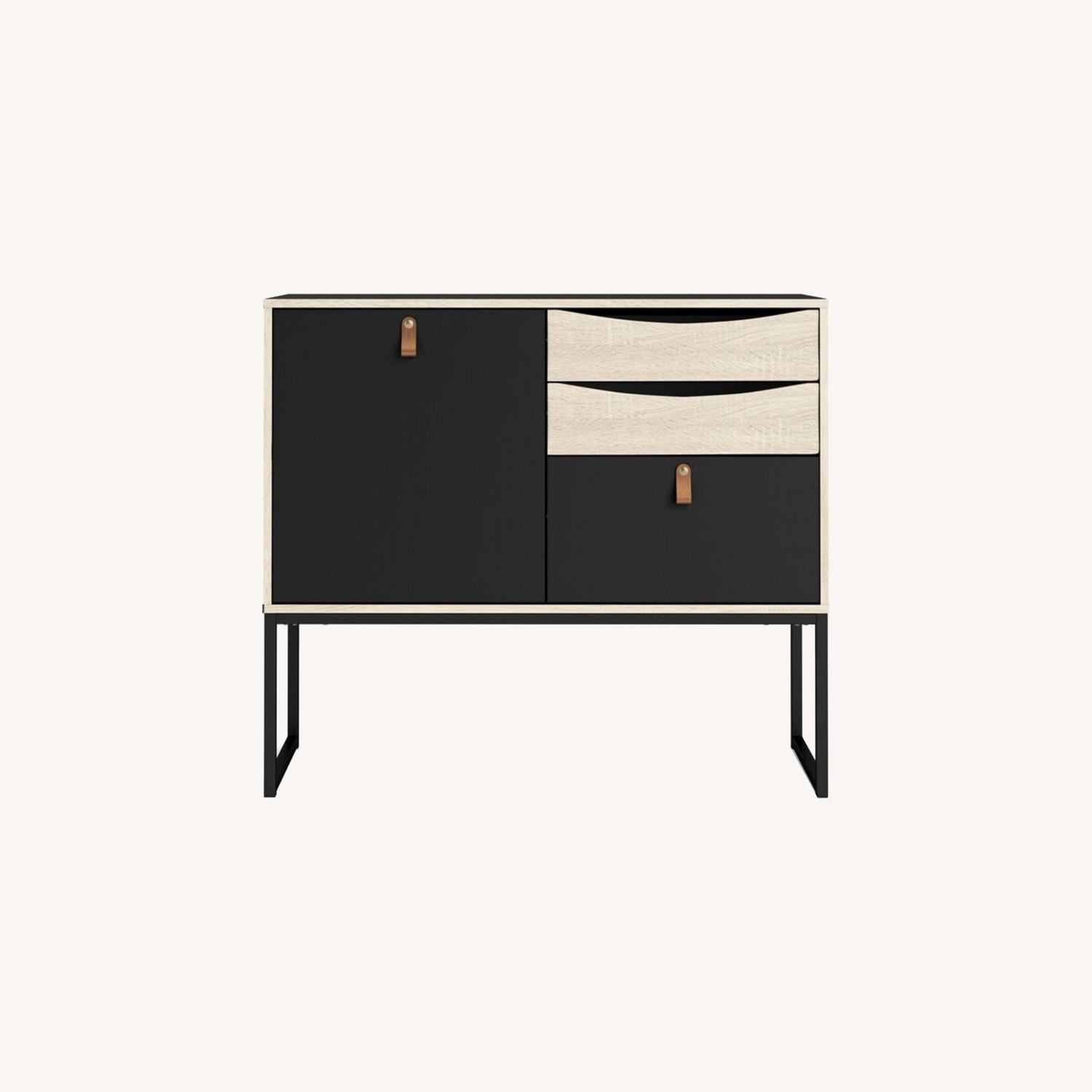 Seller's Notes:This is a beautiful Scandinavian storage cabinet with black and wood accent detail. Also, don't forget the leather pull detail! The Stubbe Sideboard is your real life dream! The Stubbe One Door Sideboard with 3 Drawers offers both storage space and display possibilities for your living room. I am selling all of our furniture because we are moving out! I bought this only a year ago and we are redecorating and moving apartments! 34.09'' H x 38.86'' W x 15.75'' D