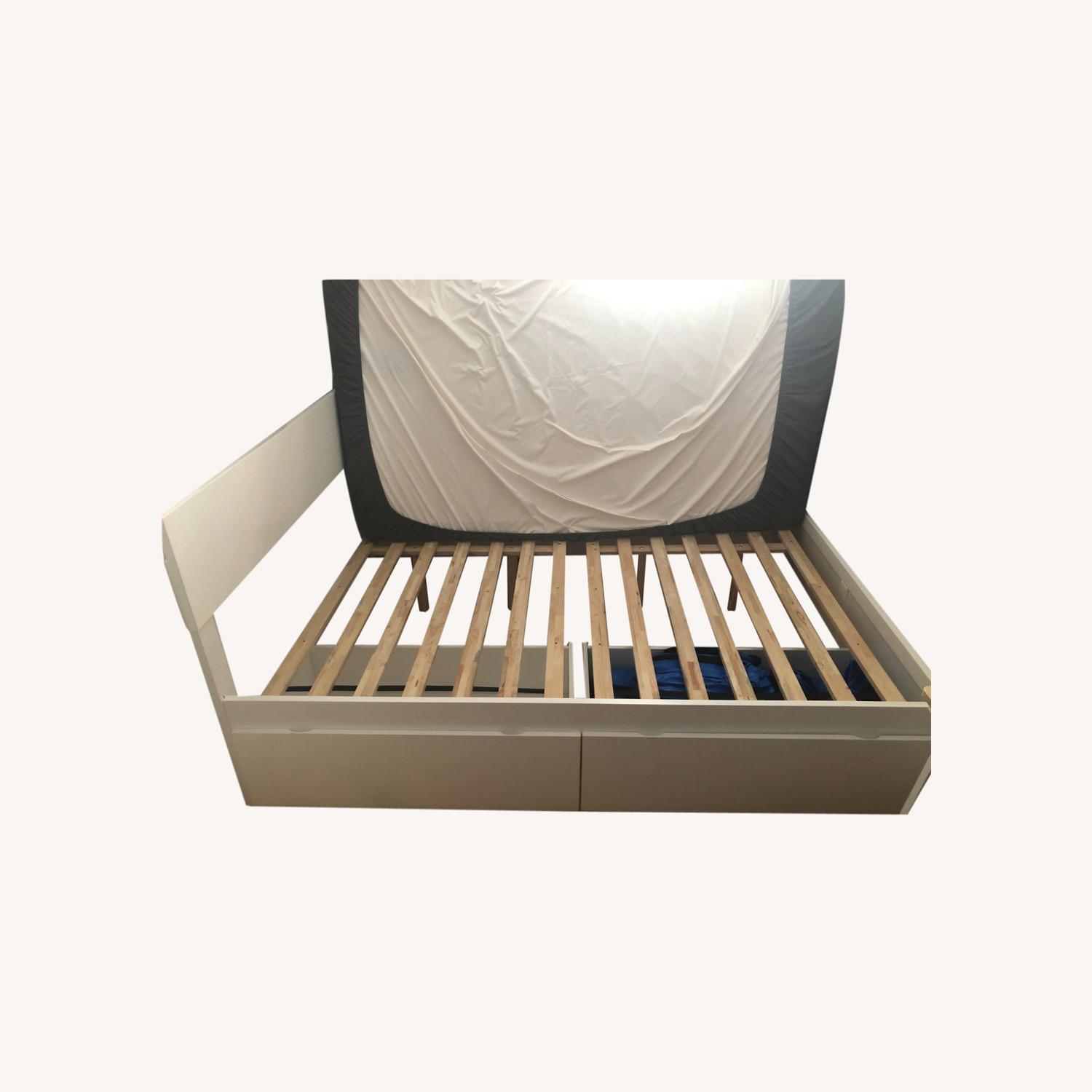 Seller's Notes:Sleek and simple platform bed with two spacious drawers that can be placed on either side of the bed. Great for small spaces. Supported by fourteen hardwood slats, no foundation or box springs required. Made from solid rubberwood. Some very minor paint scratches like the one pictured. From the Wayfair website: Clear clutter from your bedroom without sacrificing extra square footage with this space-saving storage platform bed, featuring two under-bed drawers to tuck away spare sheets and blankets. Made from solid rubberwood, this piece is complete with a system of slats to prop up your preferred mattress without the help of a box spring. Clean-lined paneling on the footboard gives this design a contemporary feel, while a non-toxic neutral finish ensures it’s versatile enough to blend with any color palette you pick.