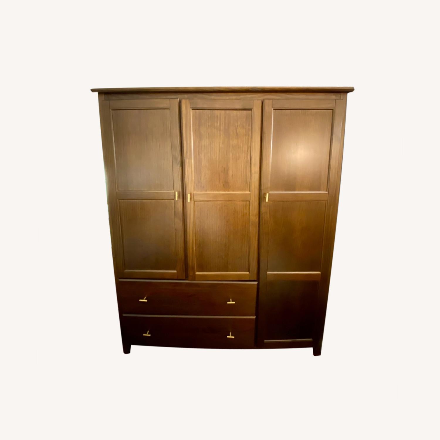 Seller's Notes:Large armoire, with extra storage. It's real wood in great condition. Really love this piece, but selling it as I'm moving and no longer have a need for it. Wood is a cherry finish. All shelves are adjustable and comes with a lower shelf that can be added below the clothing rod as well. Gold hardware is not included, but comes with original hardware instead.