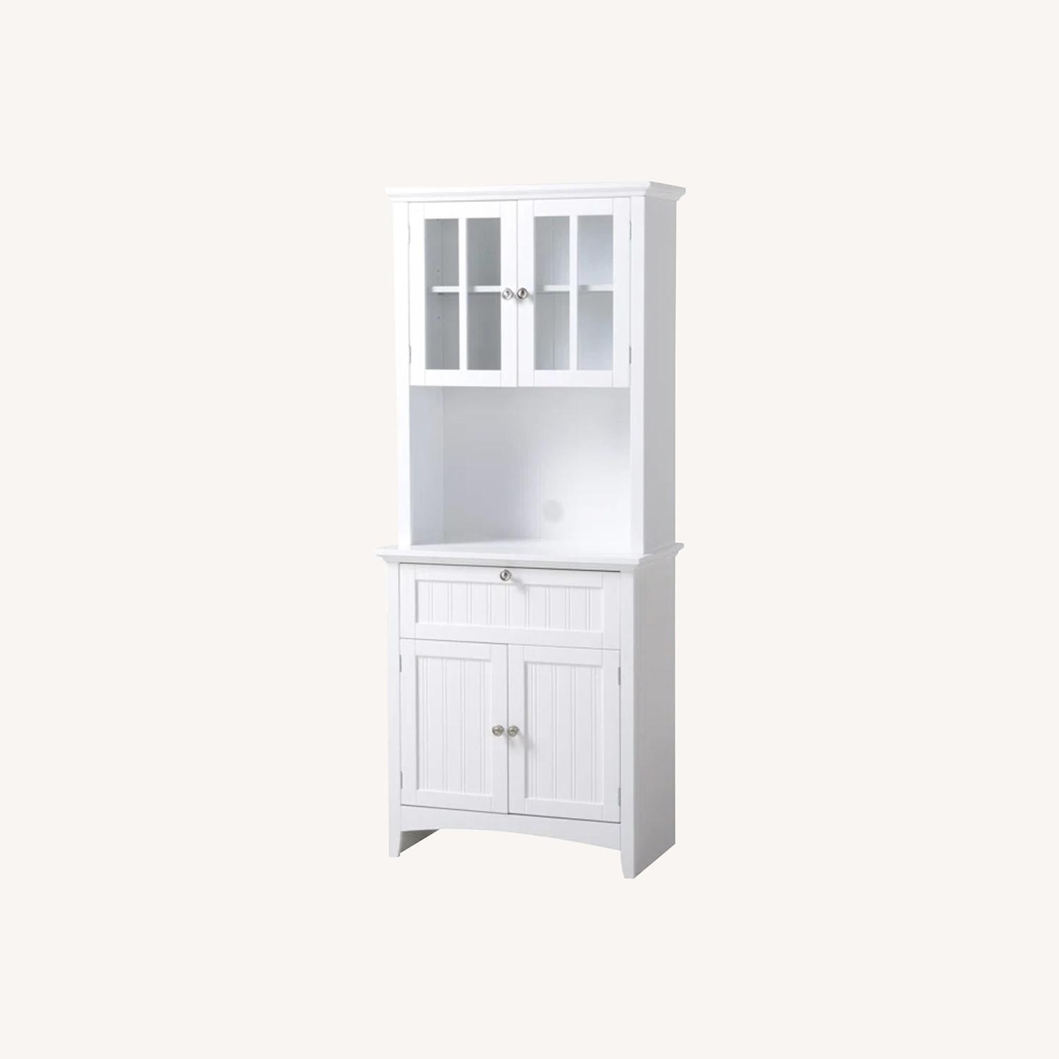 Seller's Notes:If you often find yourself out of storage space in your kitchen, we can relate. Between clearing away cookware and stashing your favorite snacks, it's all too easy to run out of space for everything a kitchen holds. This pantry cabinet is a great option for adding a touch of much-needed storage to your kitchen: crafted from manufactured wood, this piece is perfect for the breezy coastal style. The lower buffet features a cabinet with adjustable shelves and a single drawer, while the hutch showcases a glass-fronted cabinet and shelf with a wire management grommet.