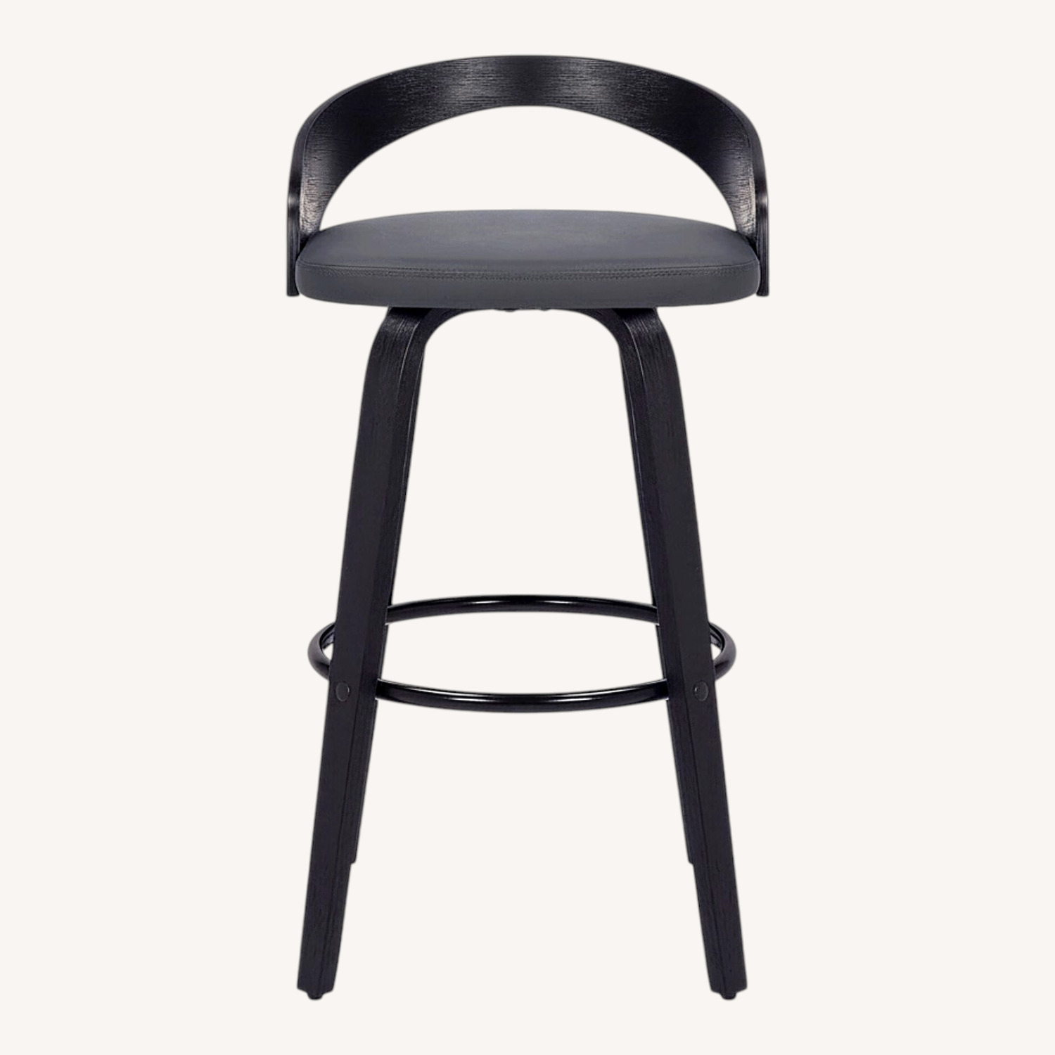 Description from Wayfair: Add a touch of mid-century modern magic to your home with the Corrigan Studio® Maxime Swivel Faux Leather and Black Wood Counter Stool. Designed with comfort and style in mind, the Maxime features a 360-degree swivel that allows you to easily interact with your friends and family regardless of their place in the room! The curved wood low back is ideal for posture alignment and unmatched support, its opening is perfect for breathable easy seating. The Maxime features a high-density foam cushion and beautiful faux leather upholstery that will allow you to sit or entertain for hours on end. The foundation of the product is supported by wood and chrome footrests for a chic aesthetic without compromising the practicality and functionality of this item.