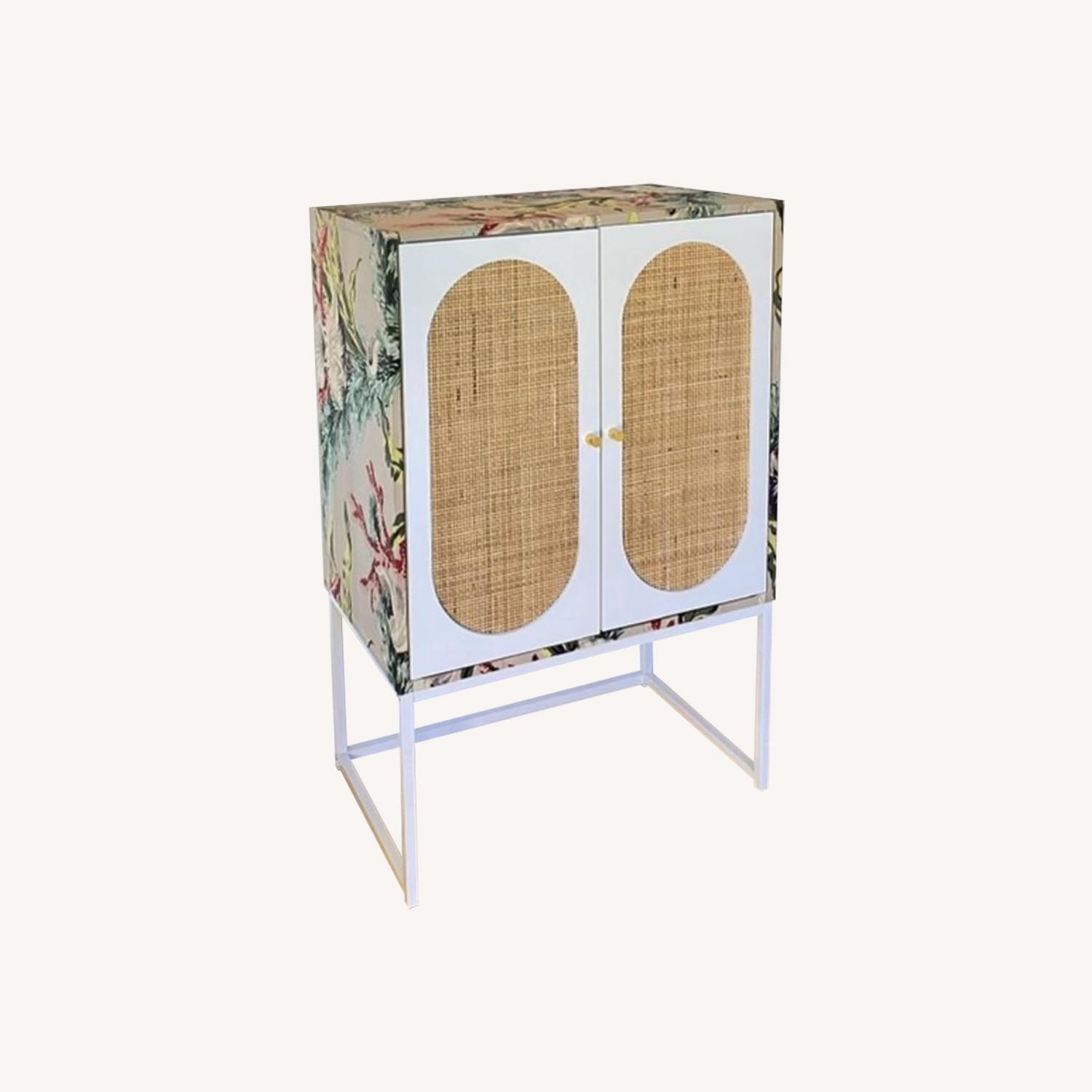 Seller's Notes:Glow up! This is a 2023 Wayfair cabinet wrapped in an antique, hand-painted, ribbed silk. This is a pre-WWII era Japanese fabric by Cohama, a historical company that specialized at the time in smaller runs of hand painted designs. They partnered later with Diane Von Furstenberg, among other luminaries. The interior is a warm ivory snakeskin (enamel painted wallpaper). Everything is sealed in polyurethane- matte for the exterior, satin interior. The cabinet has adjustable shelves, and a magnetic catch. Aluminum base. MDF core, with laminate and natural cane. I’ve added additional brackets for support, and will include a set of wall anchors. Happy to provide different/ higher resolution images, or answer any questions.