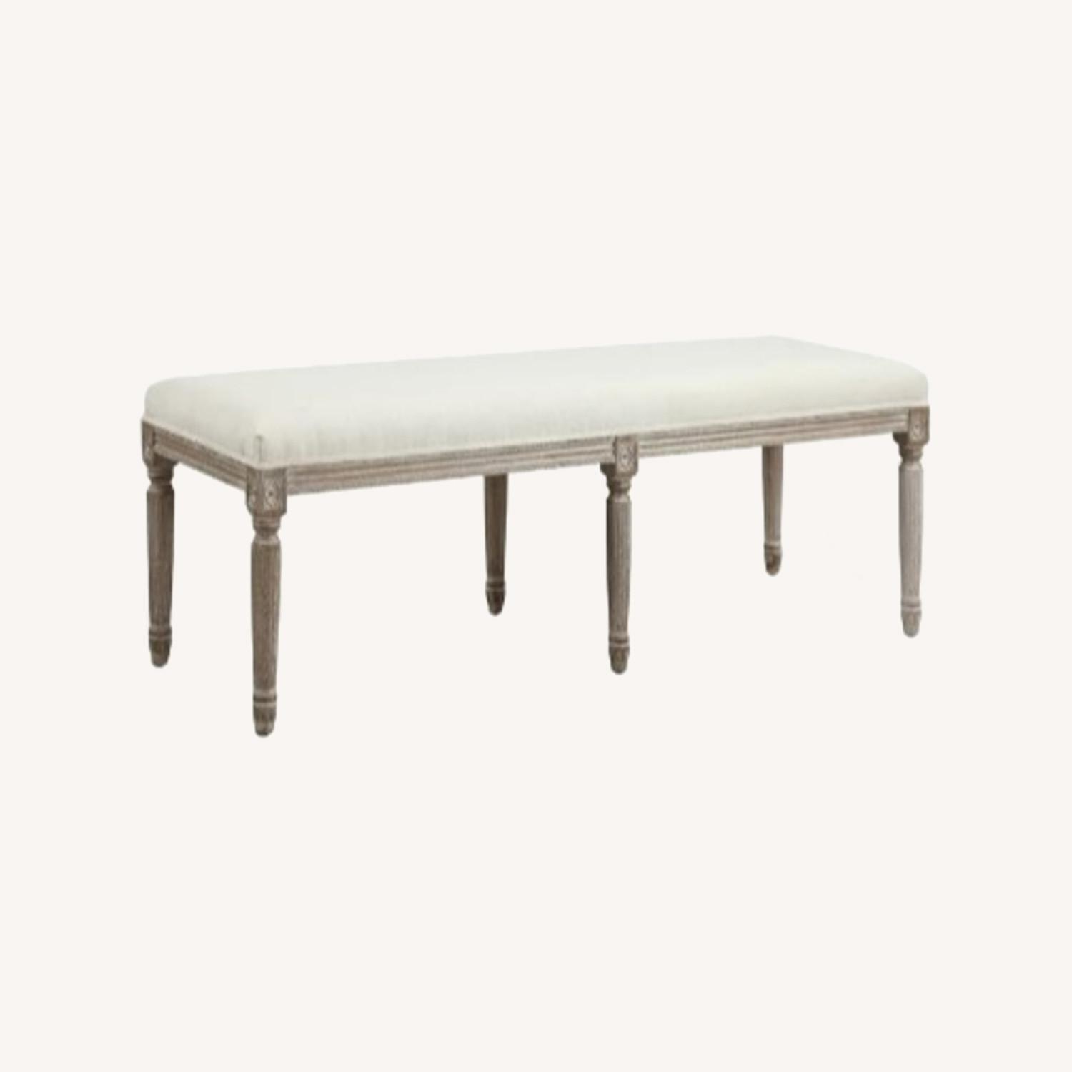 Seller's Notes:This upholstered bench elevates your bench with a classic look that fills out your space. It's crafted from solid and engineered wood in a light brown hue that's distressed for a vintage-inspired look. The elegant rectangular construction supports a down-filled cushion that provides comfort and support, wrapped in cream-colored, linen-like polyester. We love that the six legs feature turned legs and feet with refined carvings. Plus, this bench seats two, so it's just right for a busy household getting out the door in the morning.