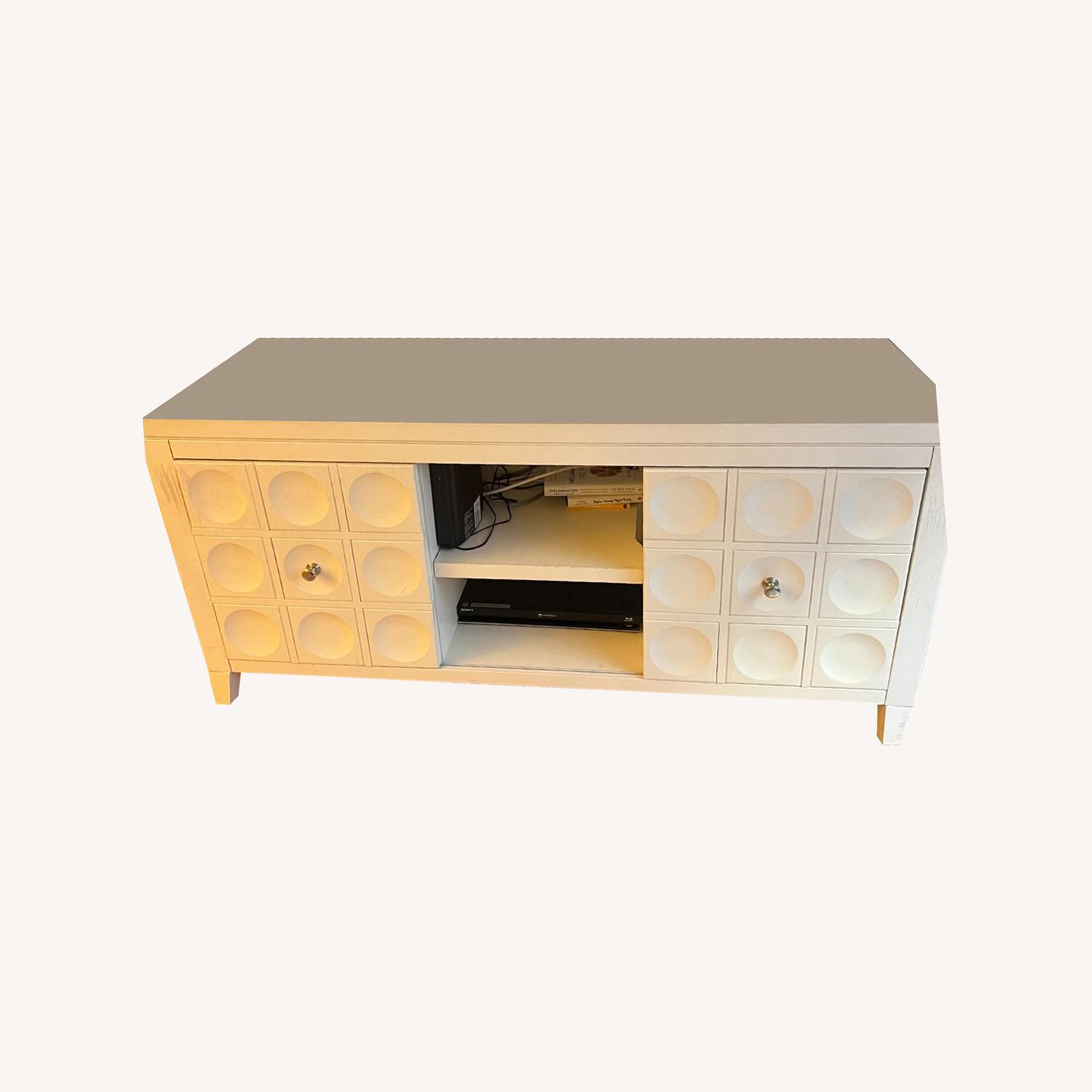 Seller's Notes:Purchased from Wayfair, this white with chrome fixture media center has great storage including two sliding door cabinets and a center open for media equipment. Currently holding a 65" TV. Near each door you'll see scratch marks (pictured) made from an eager puppy and on the top (also pictured) there's a black scratch; both can be covered by white furniture markers/paint.