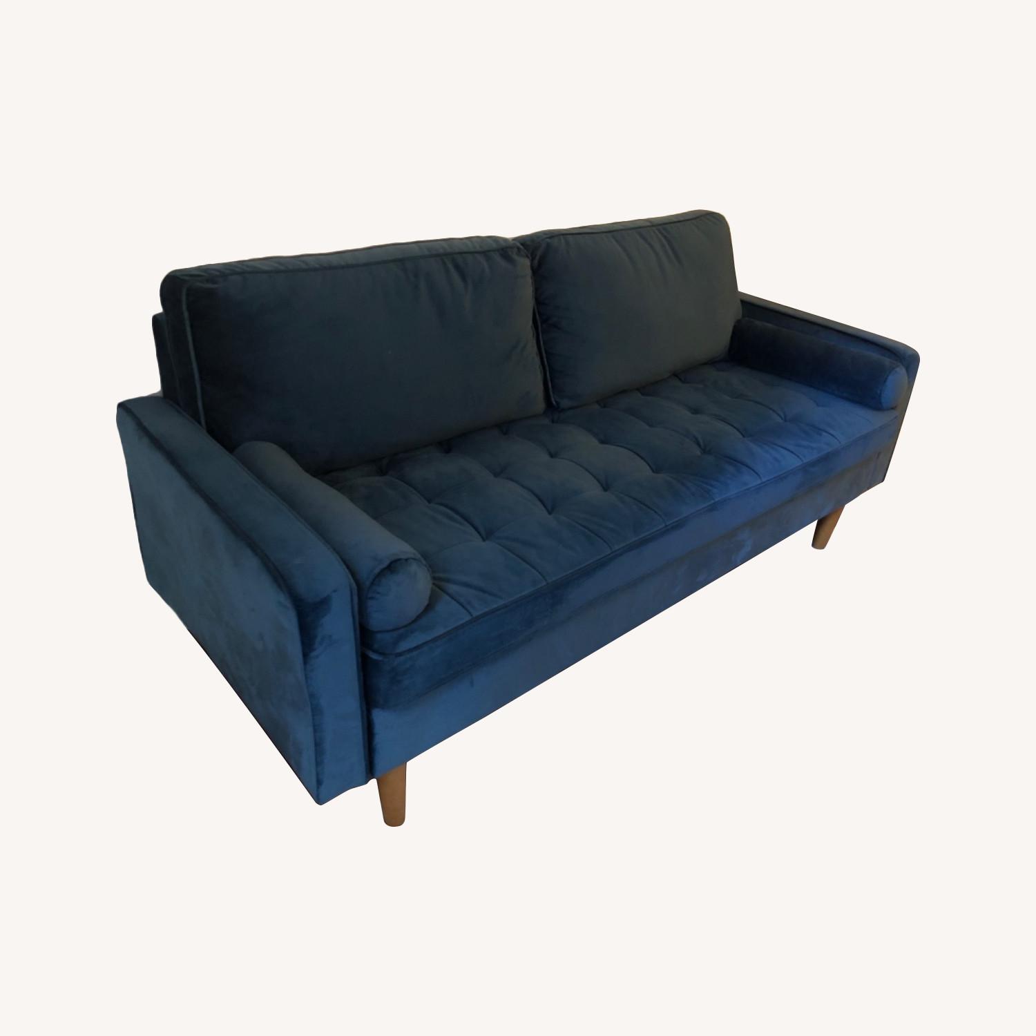 Seller's Notes:The classic design of the sofa, Mid-century modern style gives this wood frame Velvet Tufted sofa has a distinctive look that elevates your well-curated collection. It is button-tufted details that add a refined touch to any space while its streamlined silhouette and square arms fuse together to make a modern look. It features the button-tufted seat and back cushion and finished wood legs. Two bolster pillows are included.