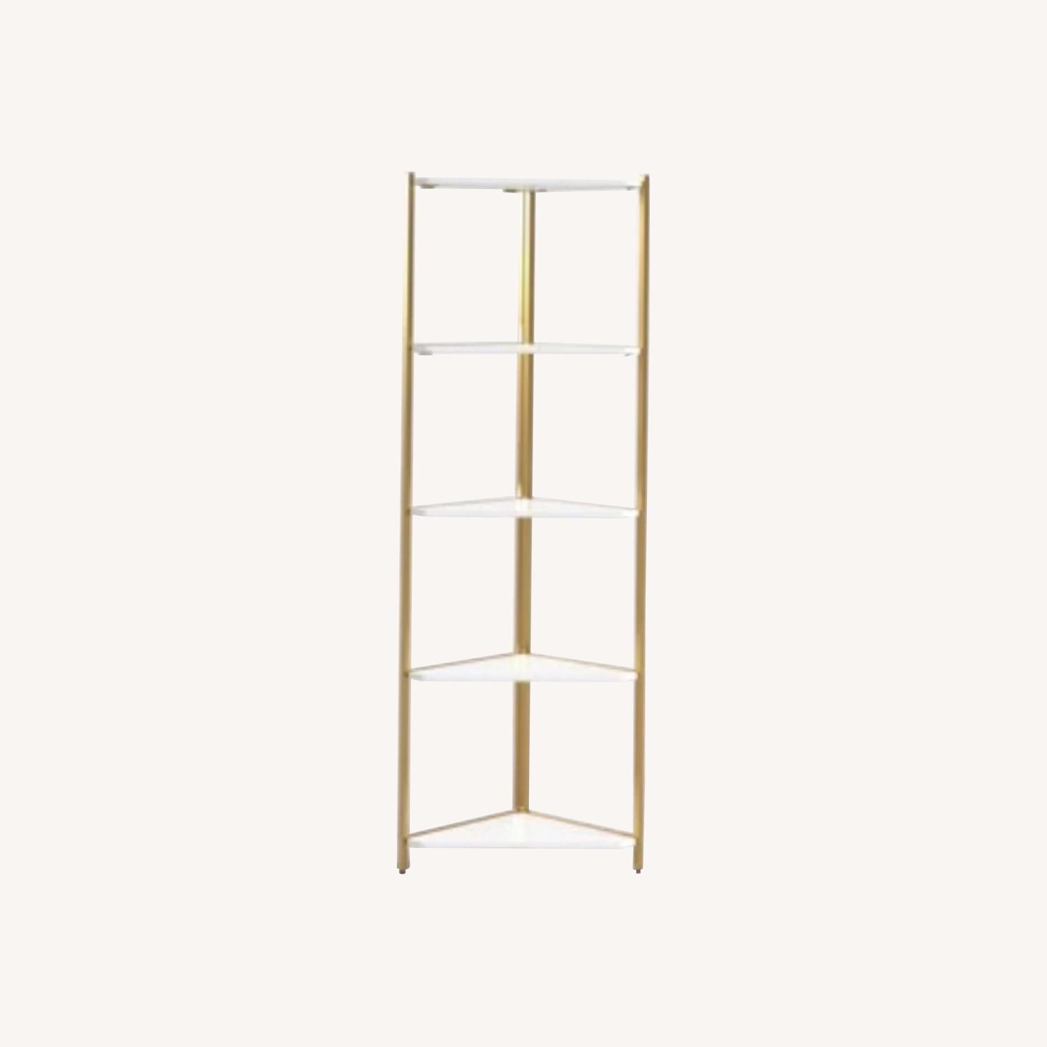 Seller's Notes:Crisp, clean, and convenient, this two-tone corner bookcase rounds out any modern ensemble. Minimalist by design, this chic bookcase features a triangular shape to easily fit into your living room, home office, or bedroom. A sturdy, freestanding metal frame comes in a gold finish and reliably supports the four white, wooden shelves. With an open design like this, your treasures and trinkets are sure to stand out for everyone to admire. A wall anchor is also included for extra safety.