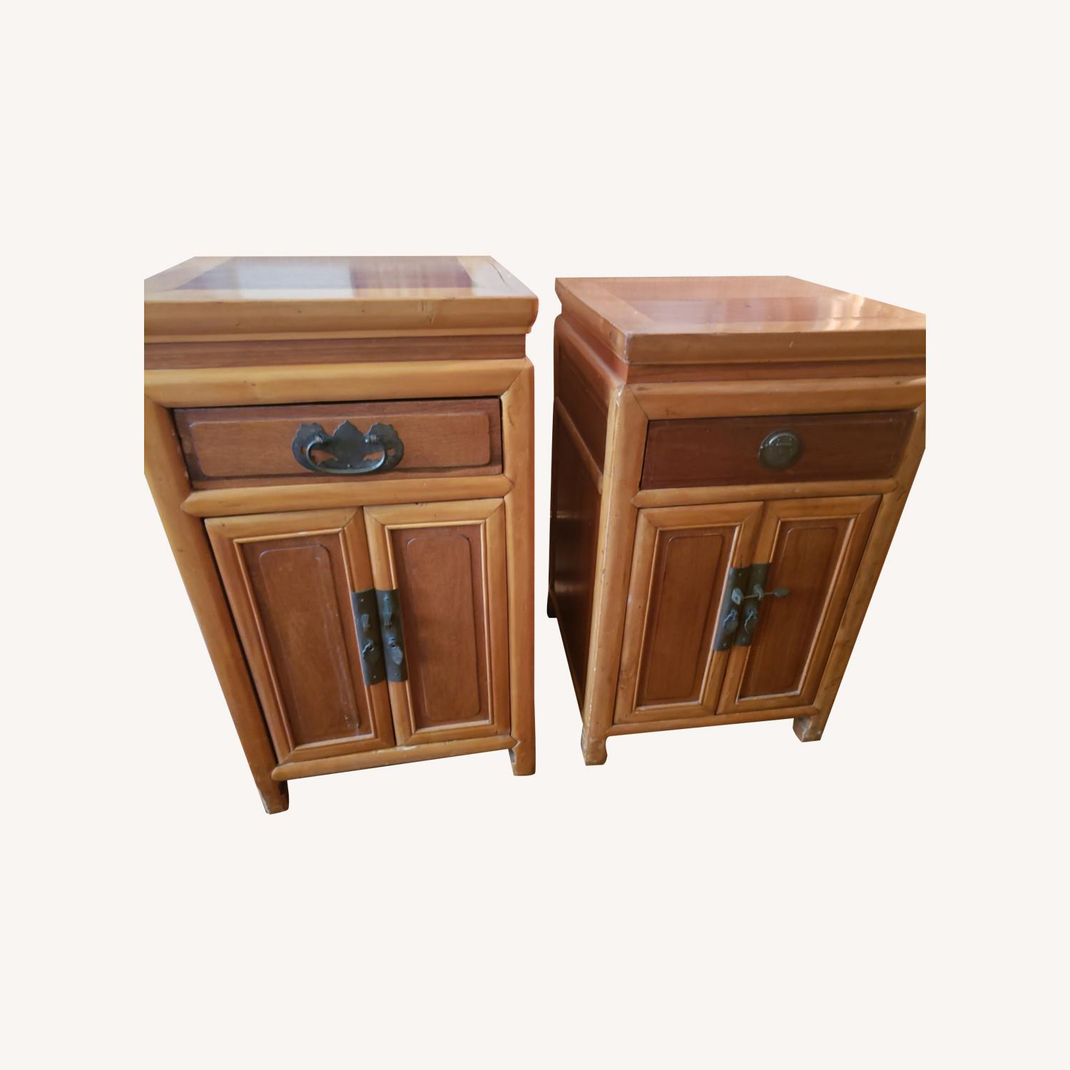 Seller's Notes:These have been with me for years when I had an Asian inspired theme. They still have a lot of life in them and are lightweight. They are a beautiful oak and teak wood with lots of storage. They look good from the side but the sides and back are a bit scratched so best placement is against a wall. The drawers work fine. and the bottom doors close but hardware is missing from one door. Please note one is slightly taller than the other but not noticeable witha bed in between