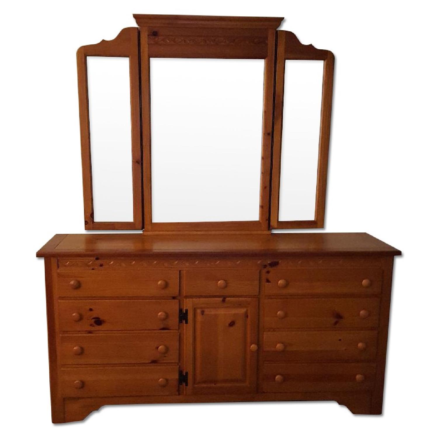 Seller's Notes:Built by the Webb Furniture Co., located in Galaxa, Va., the dresser has a lot of good years left. It has survived several moves over the past 16 years without becoming wobbly or rickety. None of the drawers are warped or difficult to open. And while there are several nicks and scratches, most of these blemishes are fairly minor and do not detract from the overall attractiveness of the piece. The tri-fold mirror sits just over 43.5 inches high by itself and is easily attached to the dresser with two rods and 10 screws, all of which are included. Decorative carvings run along the top of both the mirror and the dresser – a nice eye-catching detail. Added all together there are 12 drawers, including the three small drawers hidden behind the center doors. In regards to the various blemishes, many of them are small nicks. A deep set of scratches on top of the dresser are hidden when the mirror is in place. You will find several shallow scratches on the right side of the dresser and a mark lower down toward the rear of the panel. There are also some noticeable scratches on top of the dresser, along the two front corners. Still, it’s a solid and attractive piece of furniture.