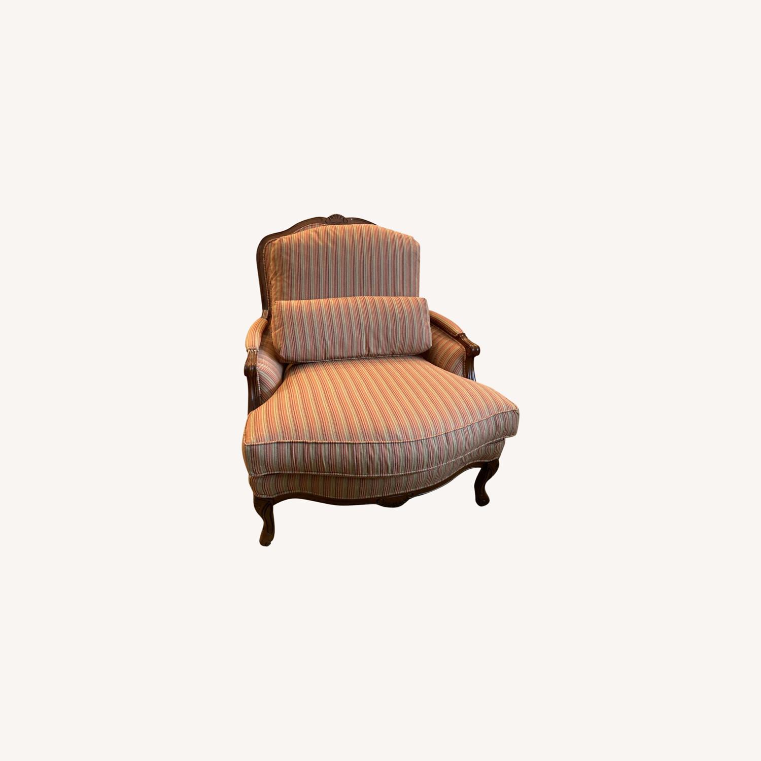 Seller's Notes:Wesley Hall Arm Chair Wood finish Claridge Mahogany Vervain Zola Stripe - Teaberry fabric
