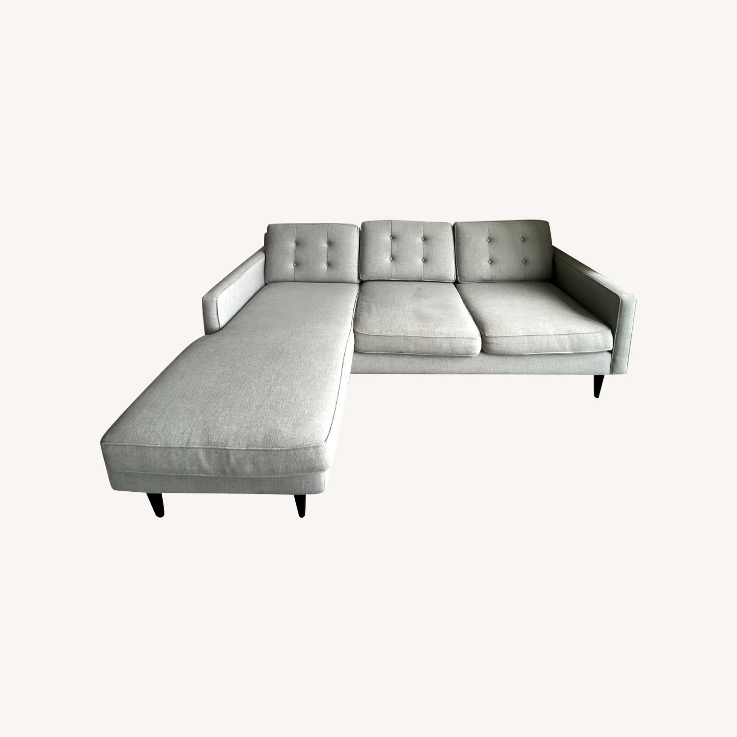 Seller's Notes:Modern West Elm 2-Piece reversible sectional in excellent condition! Very comfortable and beautiful sofa, easily seating 3 people. Product details: - Solid oak and engineered hardwood frame with reinforced joinery - High-gauge sinuous springs provide cushion support. - Seat cushions have fiber-wrapped, high-resiliency polyurethane foam cores. - Seat firmness: On a scale from 1 to 5 (5 being firmest), it's a 4. - Back cushions are foam and fiber filled. - Reversible cushions; seat cushions have zip-off covers. - Switch configuration from left to right with the freestanding ottoman and flippable chaise cushion. - Solid wood legs (removable).