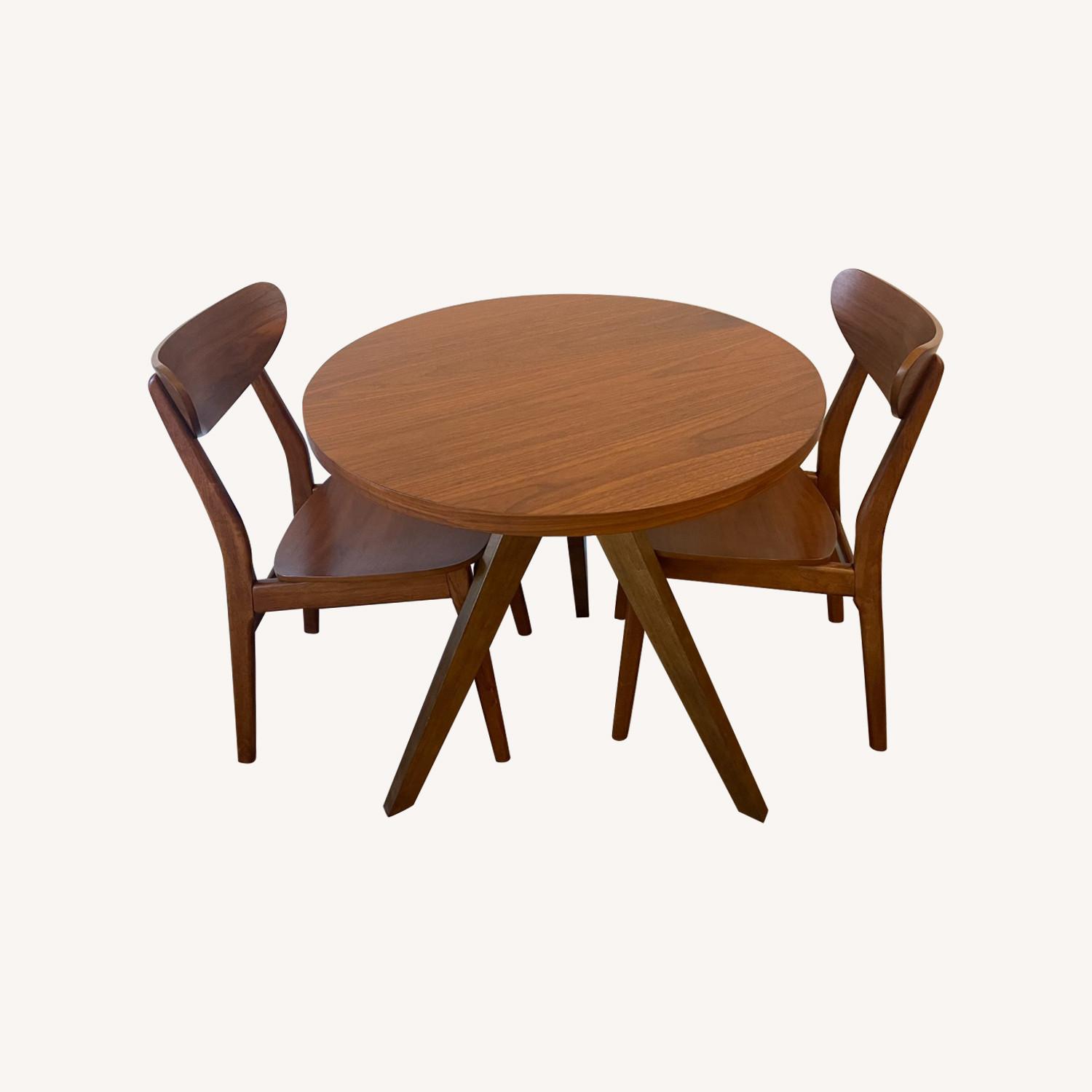 Seller's Notes:The Tripod Dining Table and Cafe Chairs are not typically sold as a set by West Elm but they are a perfect match. Barely used; in excellent shape. Table: Compact design Seating up to 3, the small footprint makes it easy to fit in even the smallest spaces. Solid wood legs. Engineered wood top covered in walnut wood veneer. Covered in a Walnut finish. Overall: 30"diam. x 30"h. Chairs: On top of its tapered legs and mid-century-inspired frame, we gave our Classic Café Dining Chair a curved seat and backrest for extra comfort. Solid rubberwood frame. Covered in an Acorn finish. Plastic caps on legs help protect floors Overall: 17.3"w x 20"d x 32"h