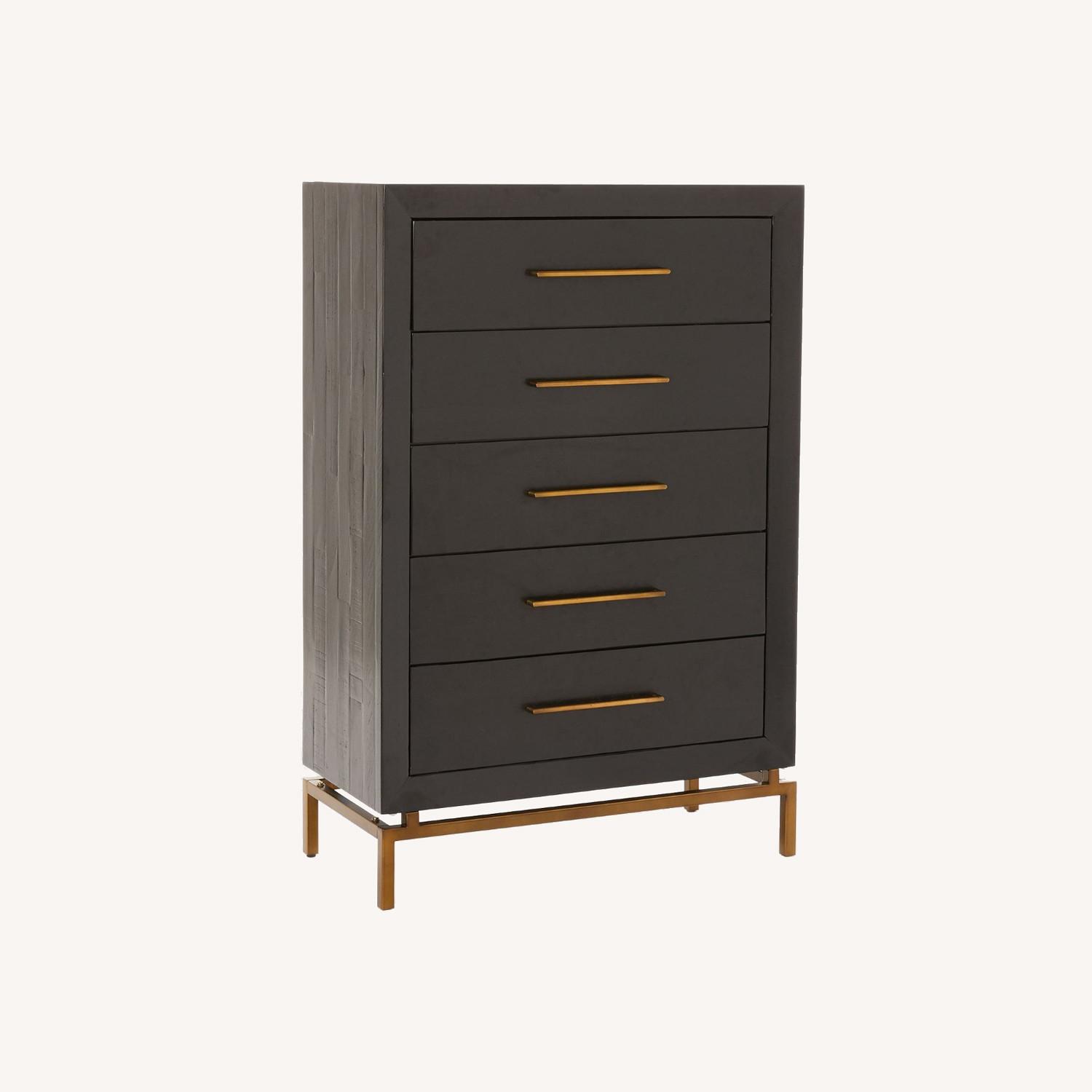 Seller's Notes:Solid acacia wood with a Burnished finish. Metal base and drawer pulls in an Antique Brass finish. 5 drawers open on wooden glides. Anti-tip kit hardware (included) is highly recommended to provide protection against tipping of furniture. Made in Vietnam.