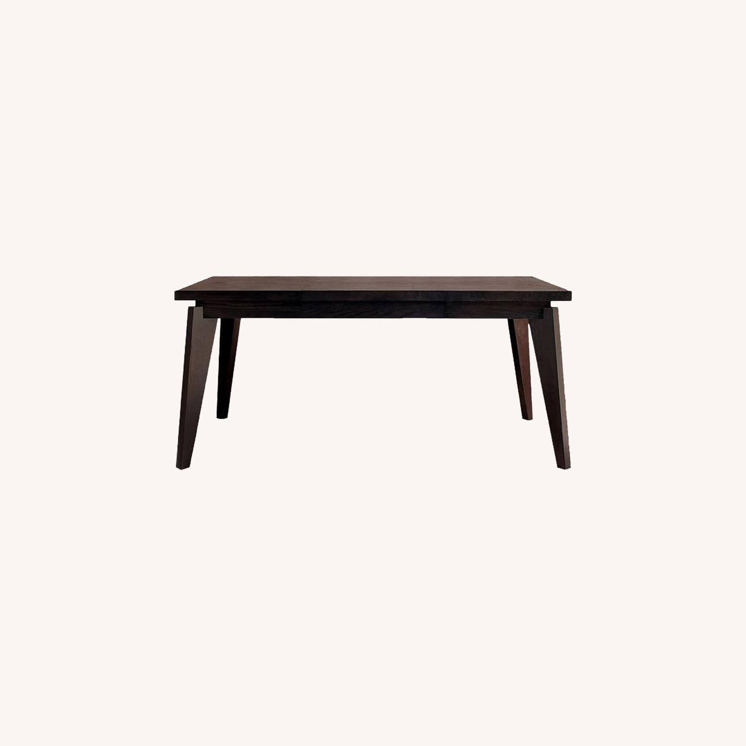 Seller's Notes:NOTE : Chips and heavily scratched A new angle on dining. Expandable to three different lengths for extra seating space, the clean, simple lines of the Angled-Leg Expandable Table make it versatile for everyday dining and serious entertaining. 42"sq. x 30"h; two drop-in leaves expand to 66" and 90"w. Solid ash wood legs with a Chocolate stain. Chocolate-stained ash veneer over a solid ash + engineered wood top. Unexpanded comfortably seats up to 6. Expanded to 90" comfortably seats up to 10.