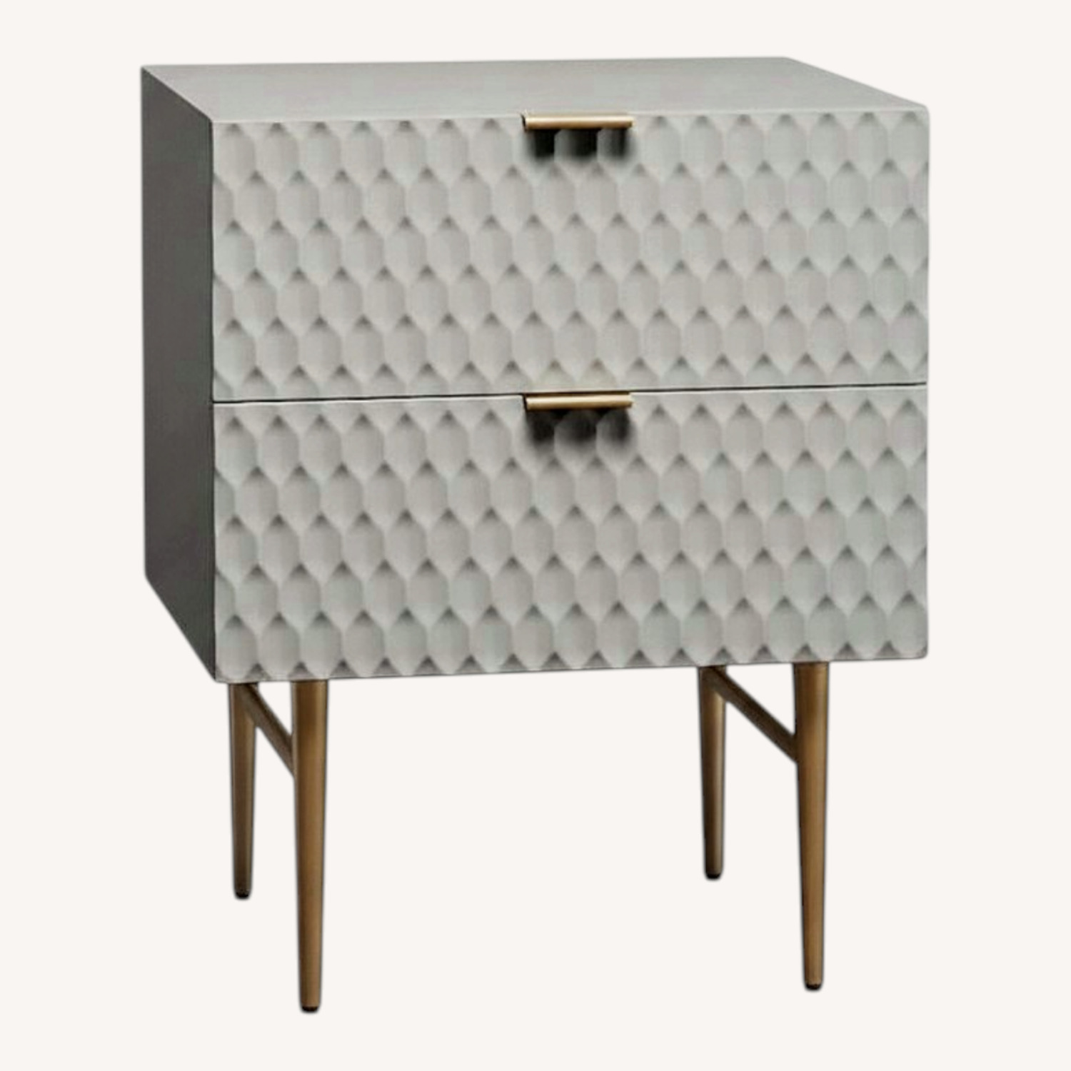 Seller's Notes:Geometric, textured drawer fronts and a lacquered wood finish stand out against clean, sleek lines. The base of this West Elm nightstand is particularly decorative, in an antique brass finish. Used with care.