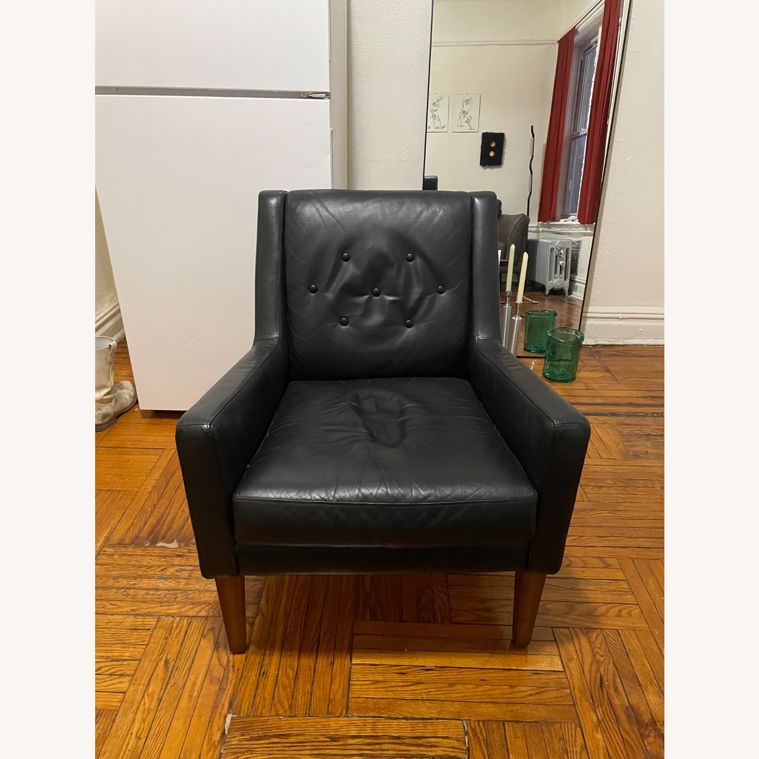 Seller's Notes:West Elm leather armchair, dark brown wood legs; legs are 9.5" high. Just moved to a new place and doesn't quite work with my new furniture. A bit worn from reading in it for the past 2/3 years but still great condition!