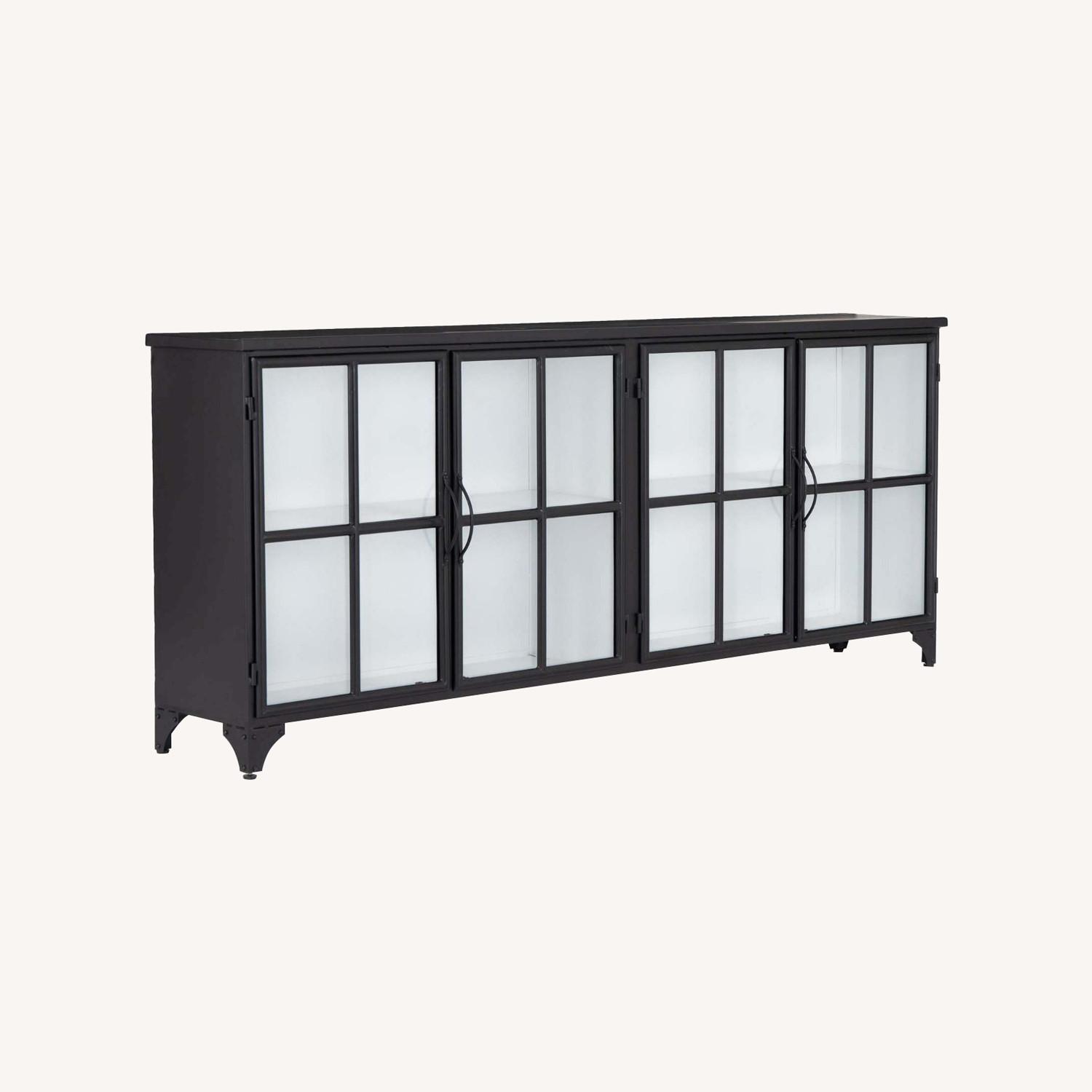 Seller's Notes:Iron frame in a distressed Black and White finish. Tempered glass doors. 2 storage compartments with 1 fixed shelf in each. Cutout openings at back for cord management. Made in India.