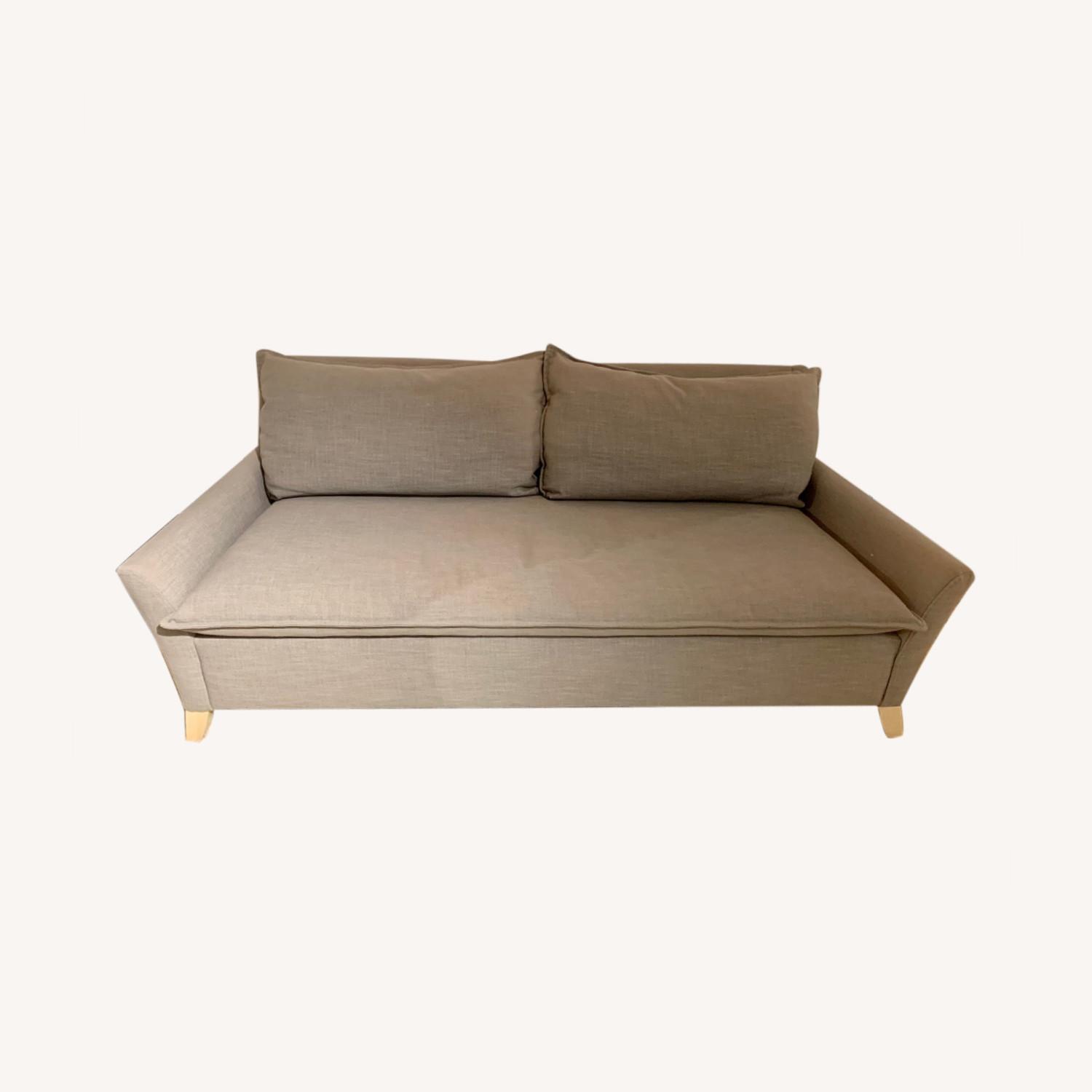 Seller's Notes:80 inch sofa from west elm. single seat cushion - great for napping Letting go as too small for new space. Fabric: Linen Weave Pebble Condition: good. Back cushions are a little deflated (as with all down cushions - can be switched out). Fabric is a little faded, but not obvious (see last photo) Currently retailing at West Elm for $1800