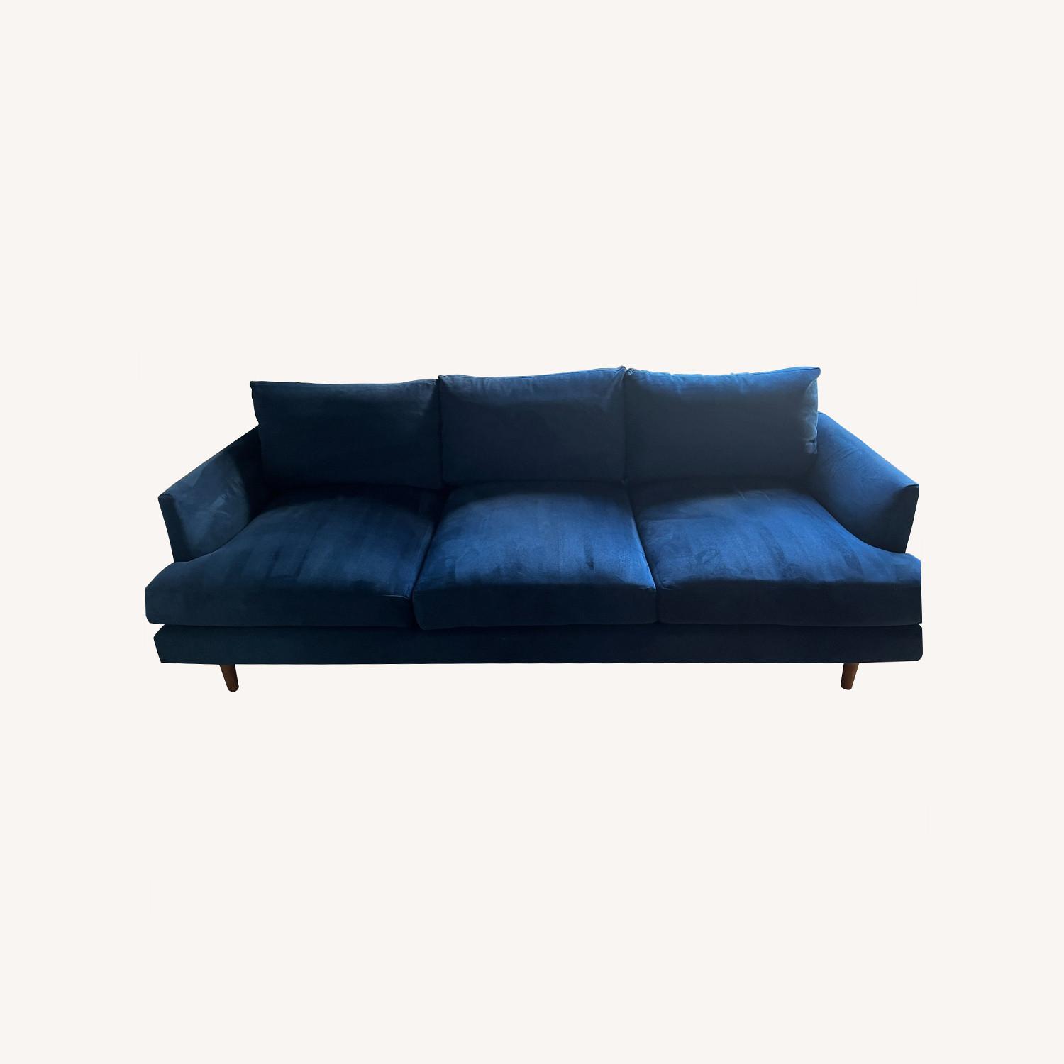Seller's Notes:Gorgeous West Elm Haven Loft Sofa and ottoman in ink blue velvet. A chic piece for any home. The ottoman is perfect for a coffee table with a tray on it, or to rest your legs. The couch is sturdy yet cozy and can fir 4 comfortably.