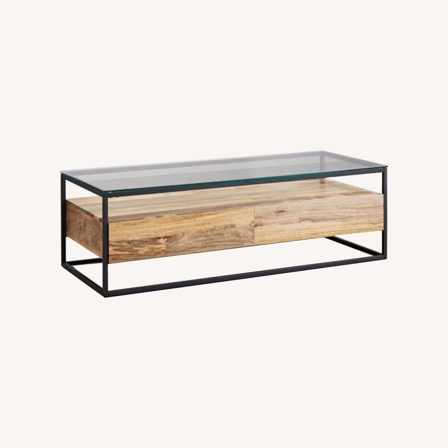 Seller's Notes:Modern and sleek coffee table from West Elm, featuring a wood and metal frame with a glass top and two drawers for extra storage. A perfect blend of style and function for your living room.
